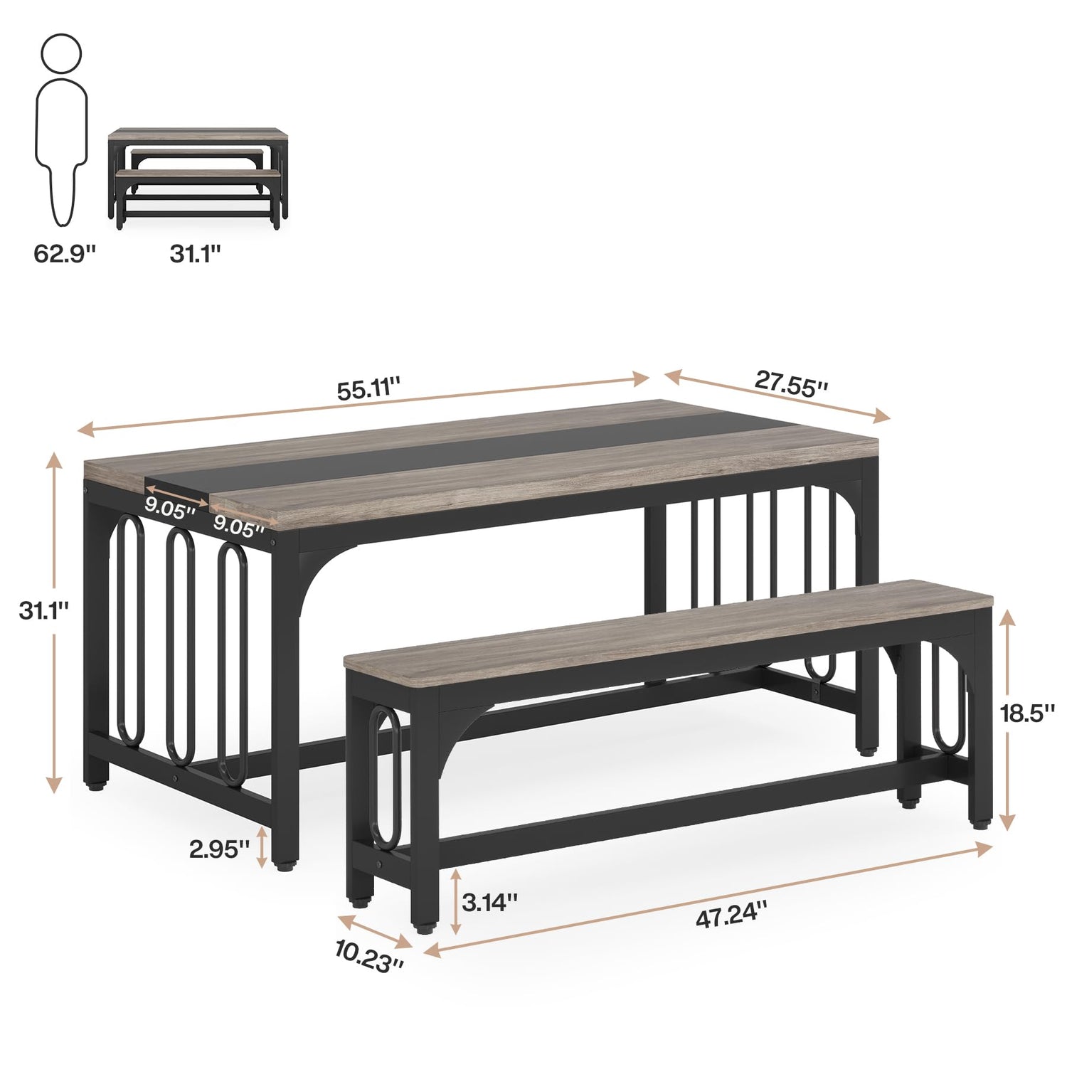 - 3 PIECE DINNING TABLE SET: The size-wise black frame with rustic table set includes 1 rectangular table and 2 benches. This 3-piece dining table and chairs set comes complete with a spacious table(55” L x 27.5” D x 31.1” H) and 2 benches(47.2” W x 10.2” D x 18.5” H each).