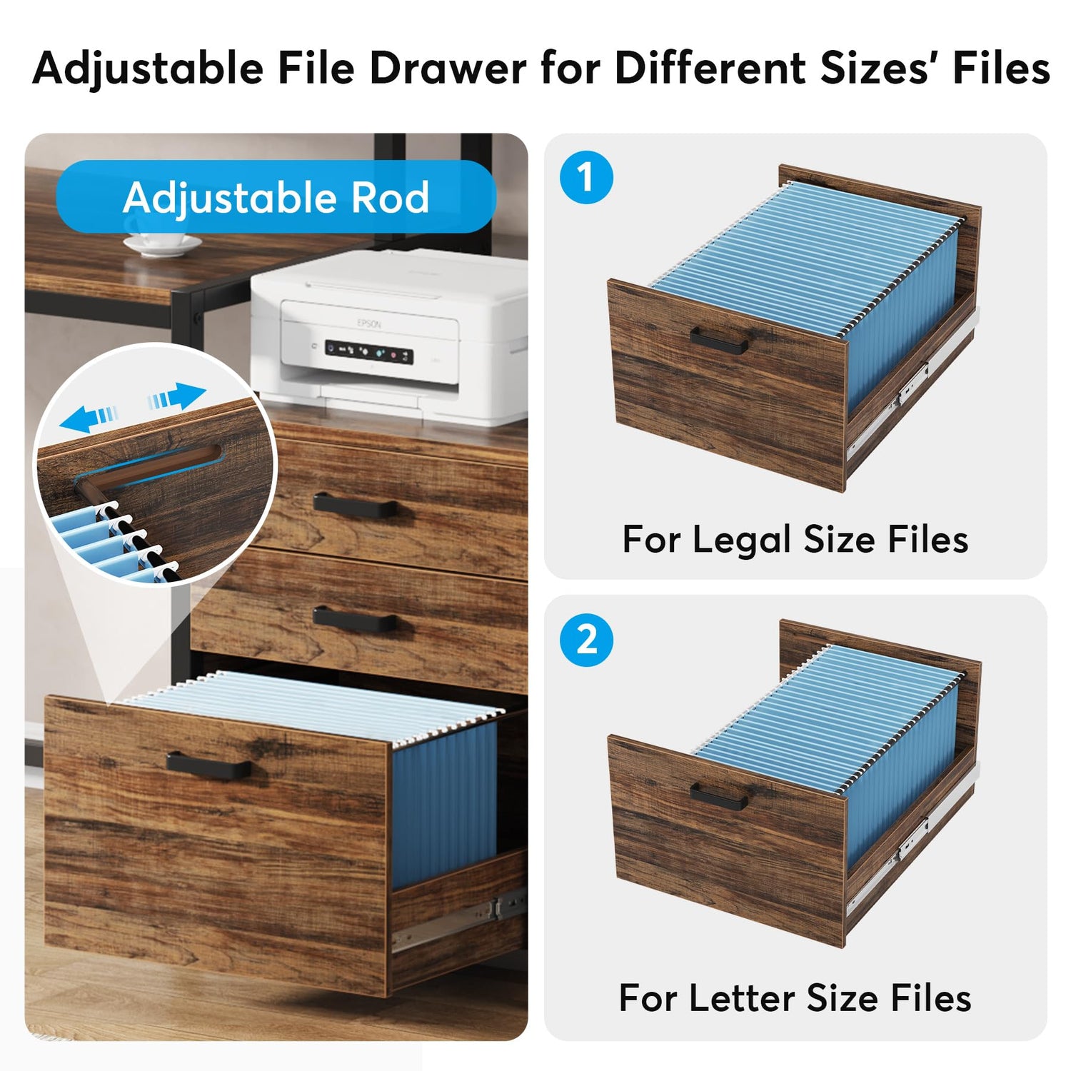- [VERSATILE FILE CABINET]: Versatile file cabinet keep everything you need well organized and easily accessible. Two small drawers offers storage solution to your home office supplies. The adjustable file drawer is suitable for hanging legal size or letter size files. The suitable top space of the file drawer cabinet makes it work as as printer stand as well.