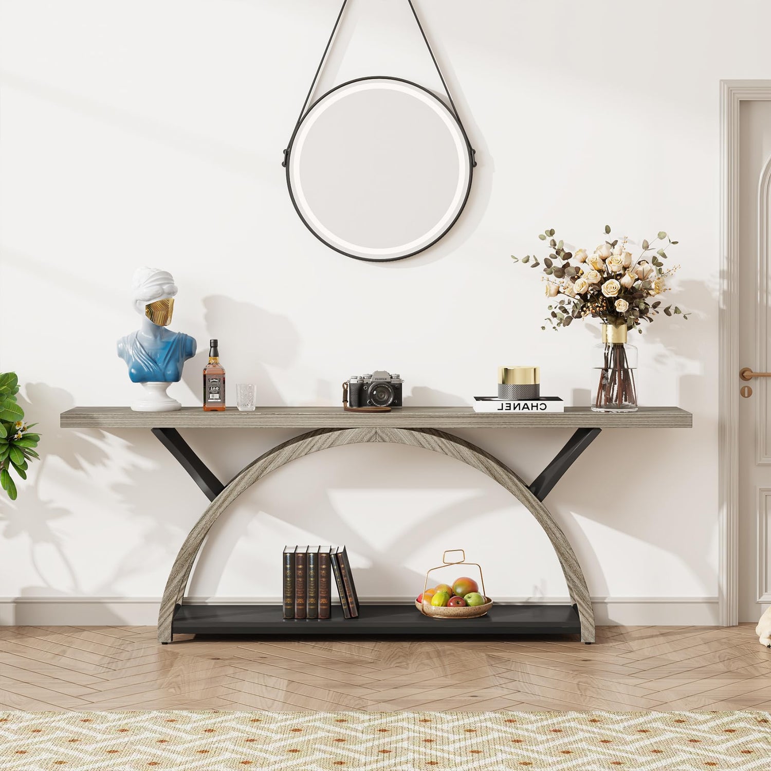 Tribesigns 70.87" Console Table with Storage Shelf, Narrow Long Sofa Table Behind Couch Table, 2-Tier Rustic Entryway Table with Half Moon Frame for Hallway Living Room, Gray & Black (Gray & Black)