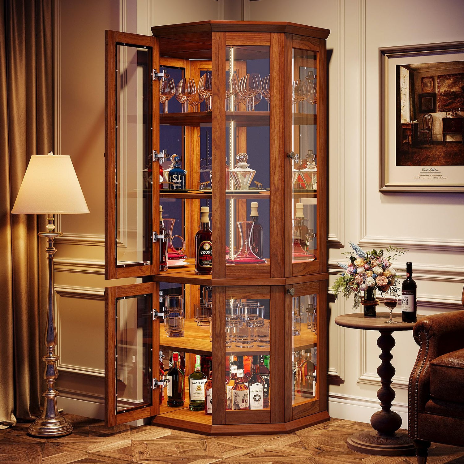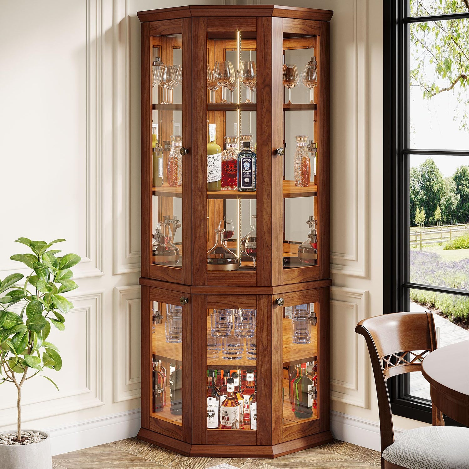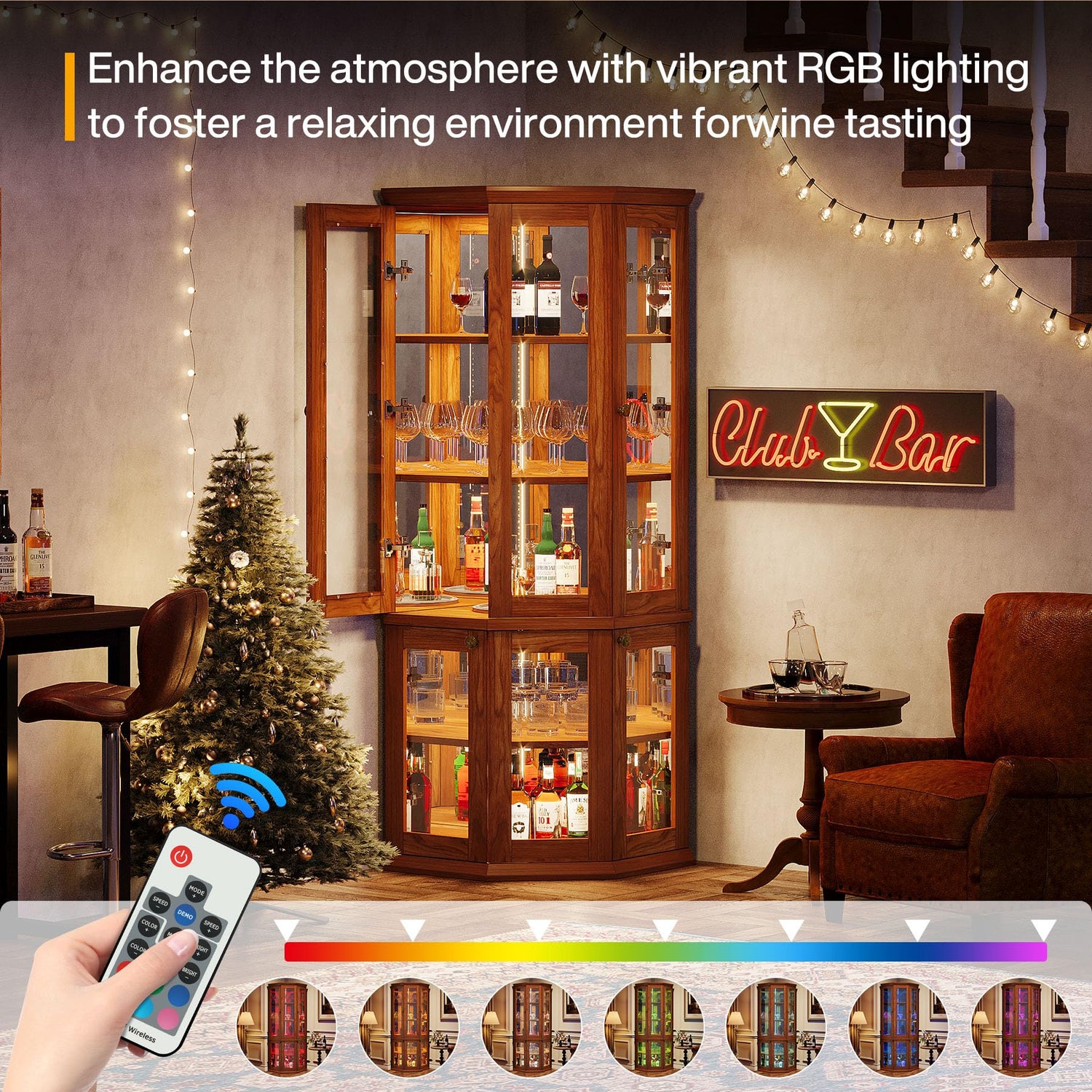 Tribesigns 70.87-Inch Corner Bar Cabinet, Tall Modern Corner Wine Cabinet with Doors & LED Lights, 5-Tier Home Bar Liquor Cabinet for Dining Room, Living Room, Kitchen, Rusitc Brown