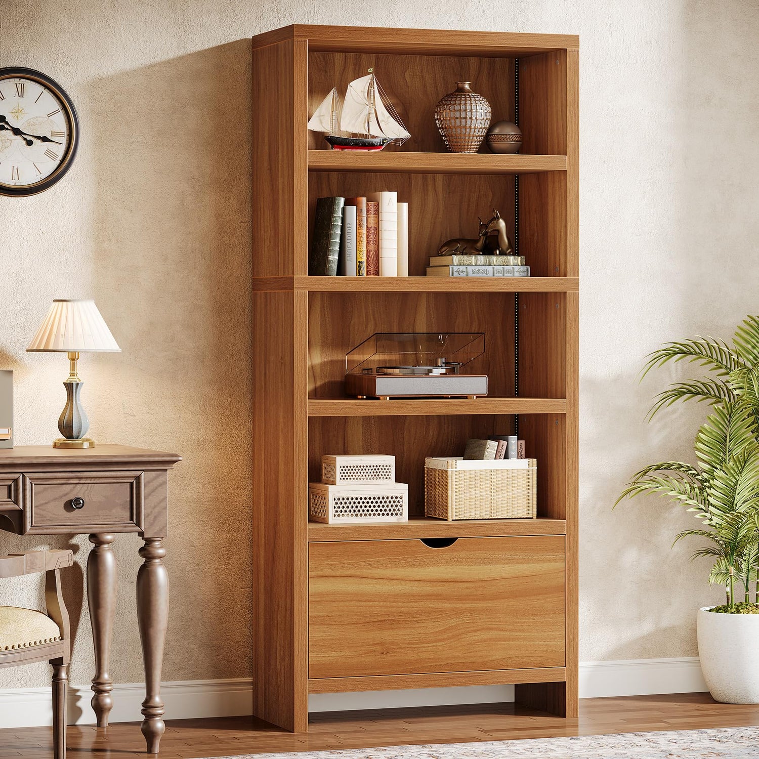 Tribesigns 70.9" Tall Bookshelf with File Drawer, Farmhouse 5-Tier Bookcase with LED Lights, Wooden Open Display Shelf Organizer for Living Room & Bedroom & Home Office (Walnut)