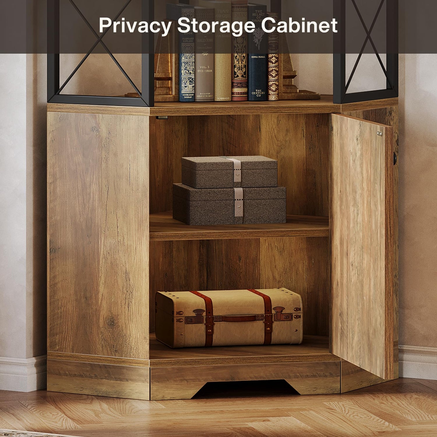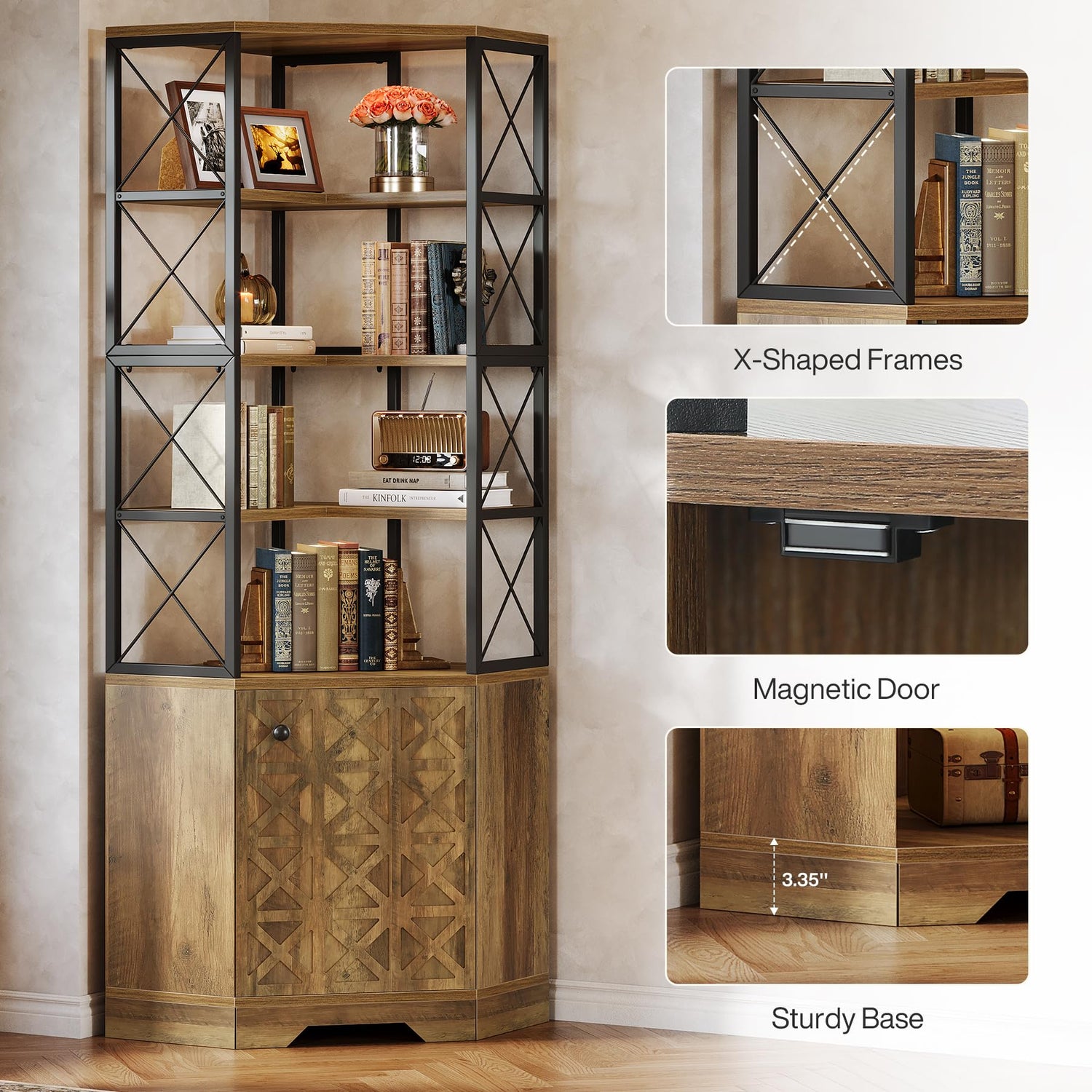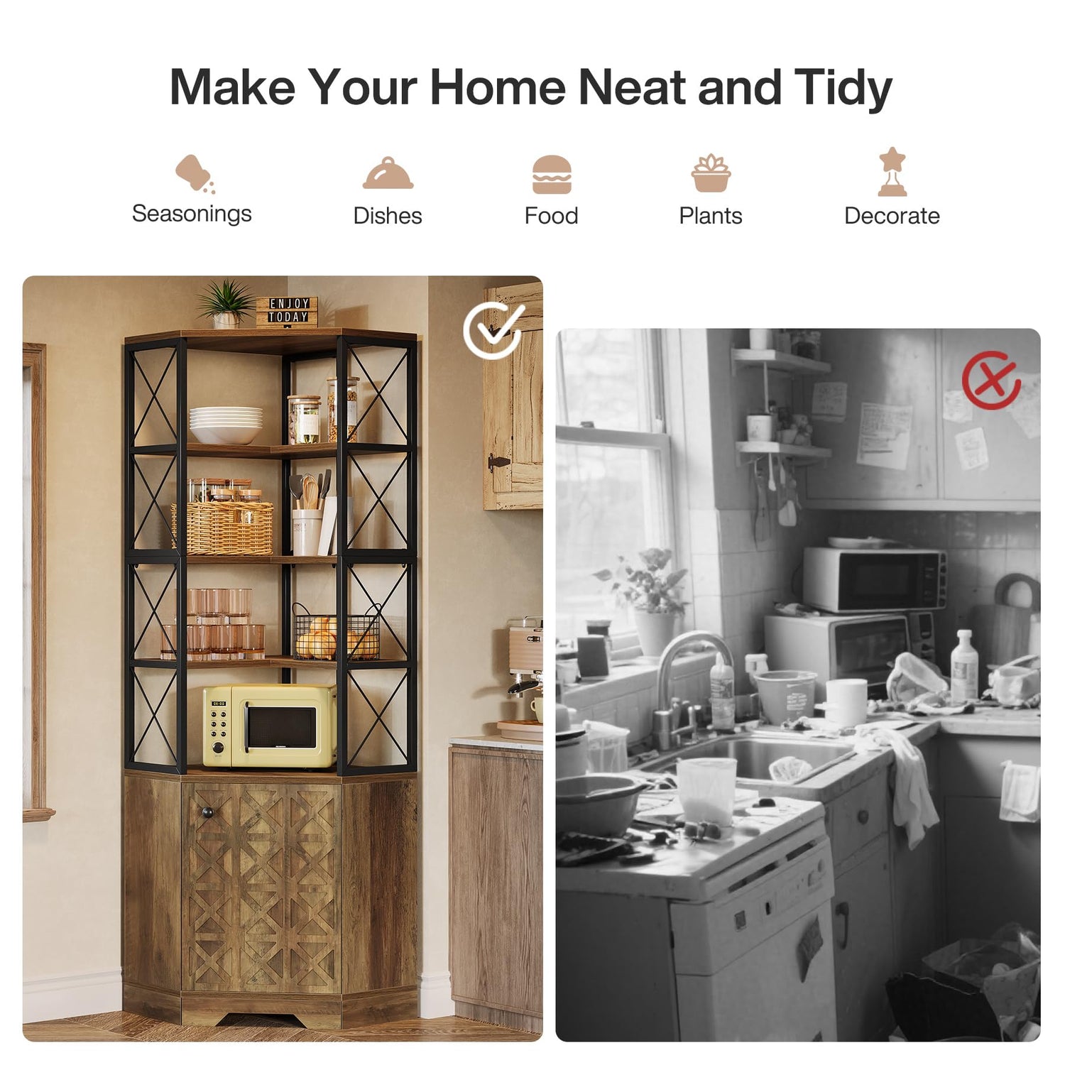 - Maximize Every Corner: Transform unused corners into valuable storage with this 23.62" L x 23.62" W x 75.98" H freestanding unit. It’s ideal as a corner kitchen hutch, tall bookcase, or display rack for apartments, dorms, and compact spaces