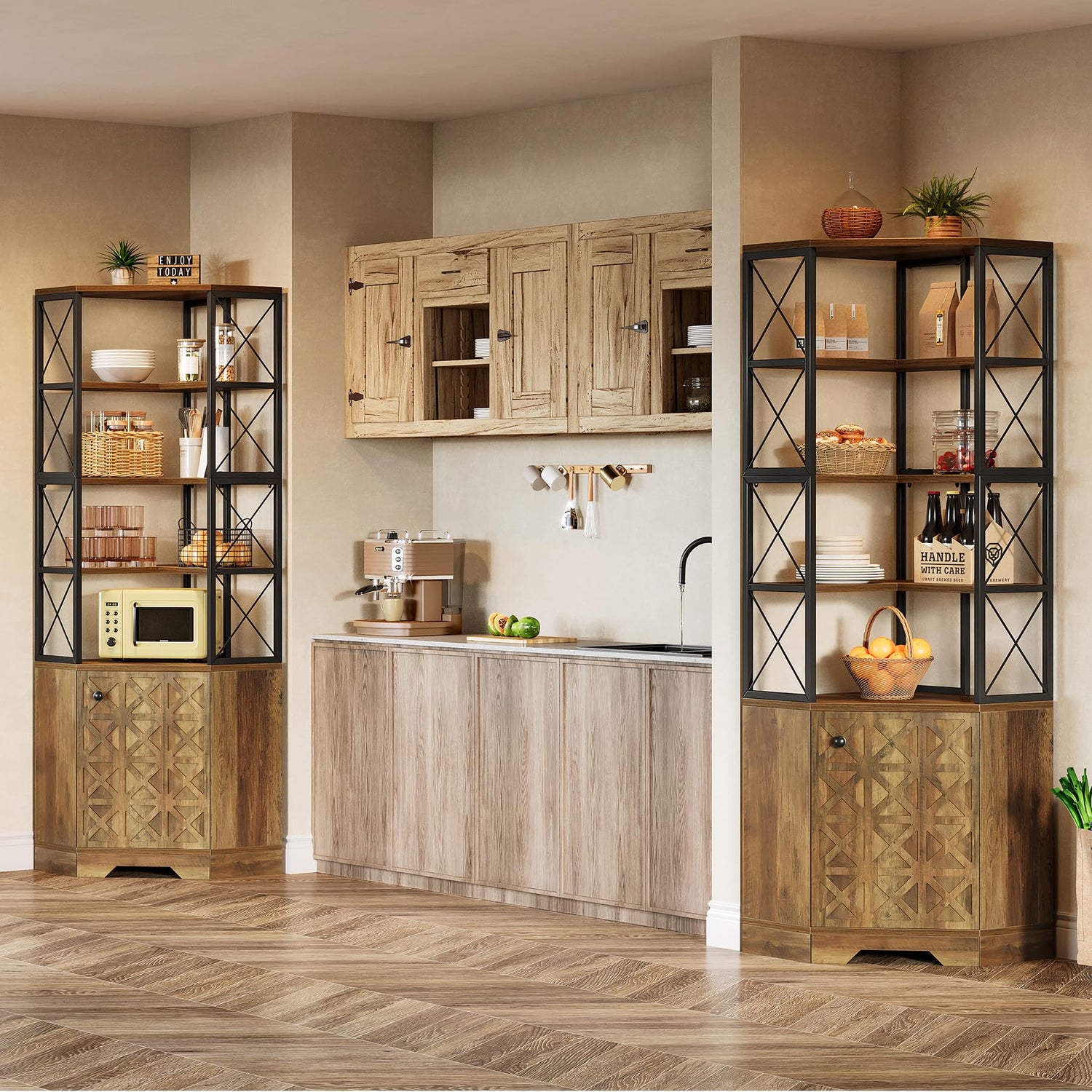- Rustic Industrial Charm: Combining warm wood tones and black metal with geometric cabinet detailing and X-frame accents, it blends modern farmhouse and industrial aesthetics for a versatile look