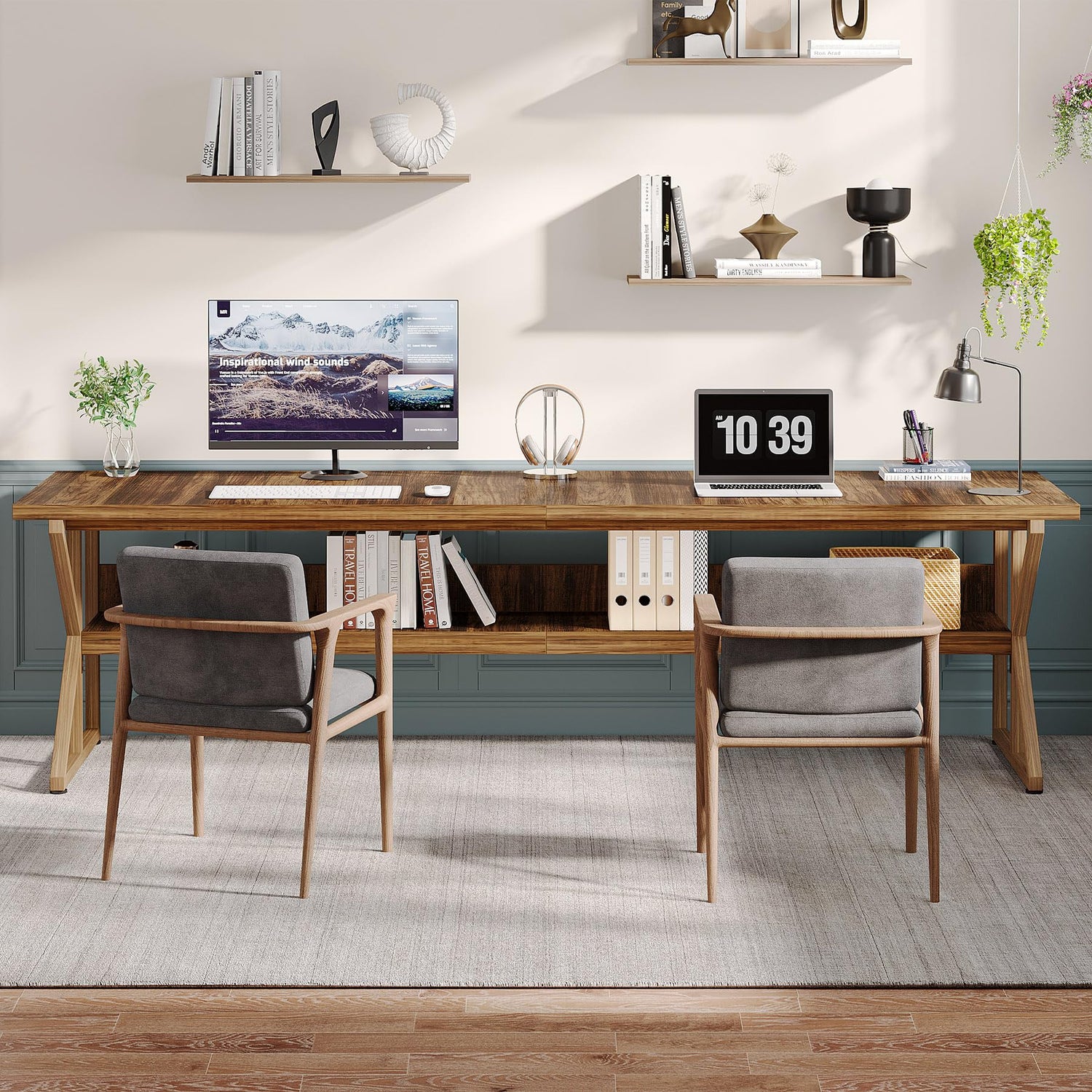 - DOUBLE DESK DESIGN: This long desk features a double workstation with storage shelf. It's perfect for your classmates, colleagues, family, and you to study, play games, and work together. Whether you're at home or in an office, this 2 person desk is your perfect choice.