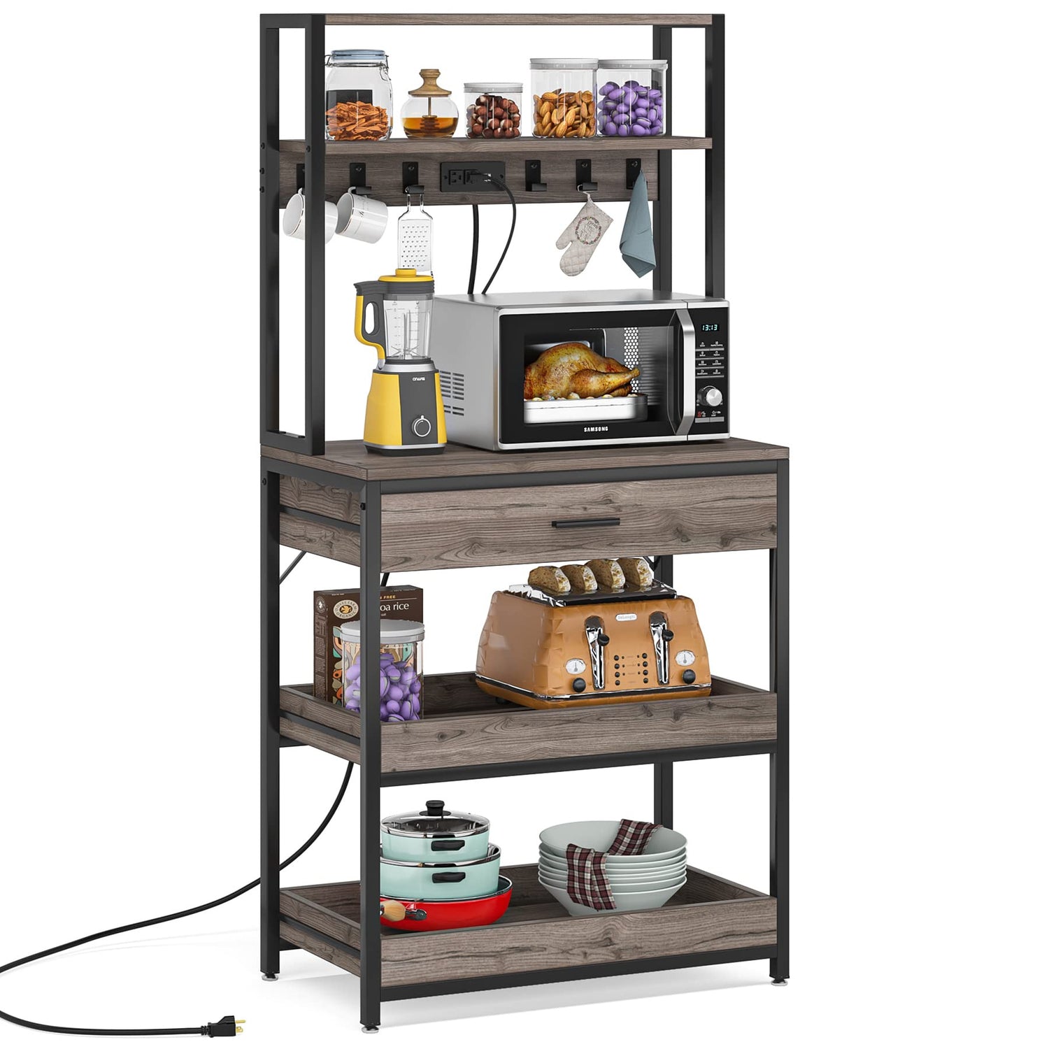 Tribesigns Bakers Rack with Power Outlets, 5-Tier Kitchen Storage Shelf, Microwave Oven Stand with Drawer, 65”H Coffee Bar Table, Kitchen Rack with Sliding Shelves and 6 Hooks, Grey