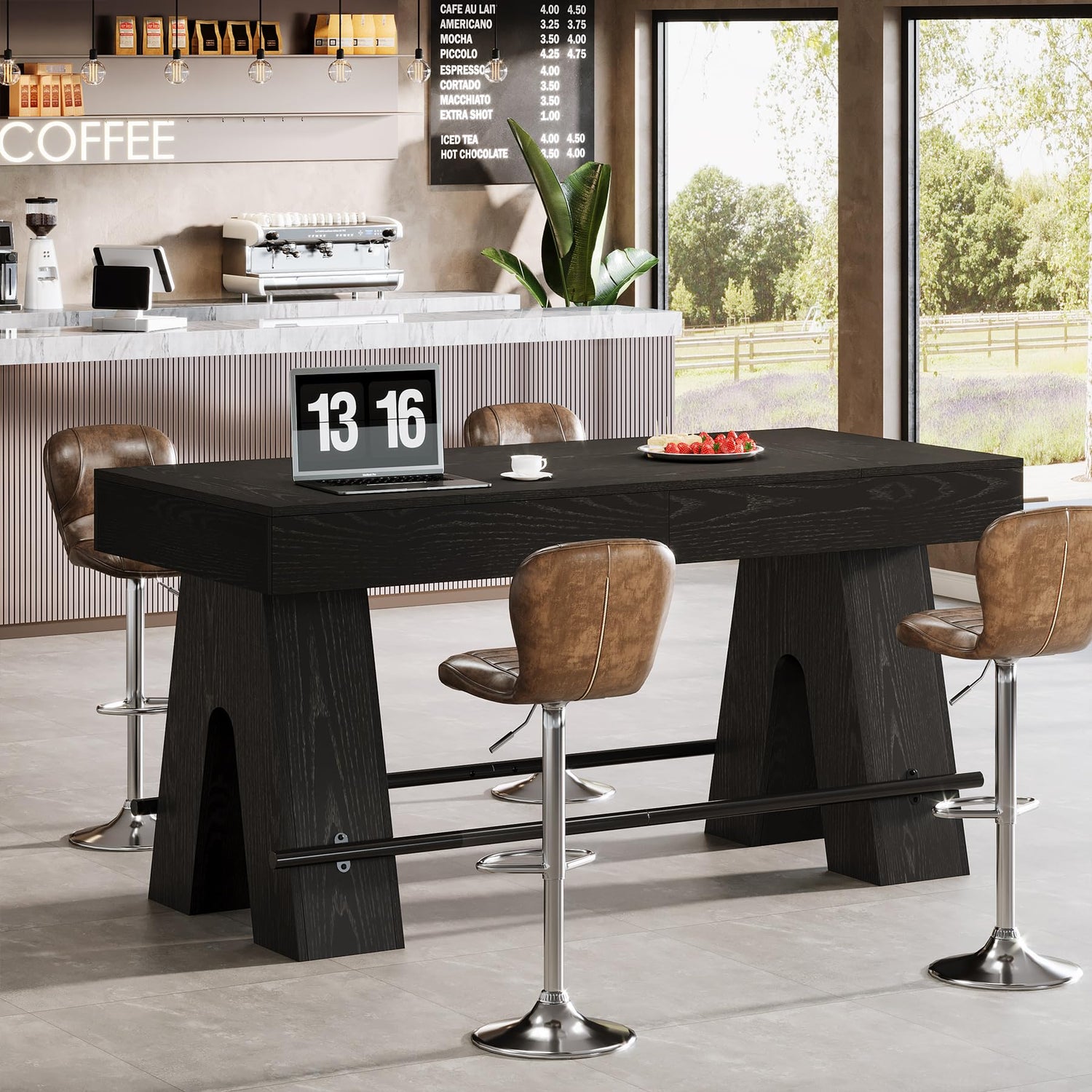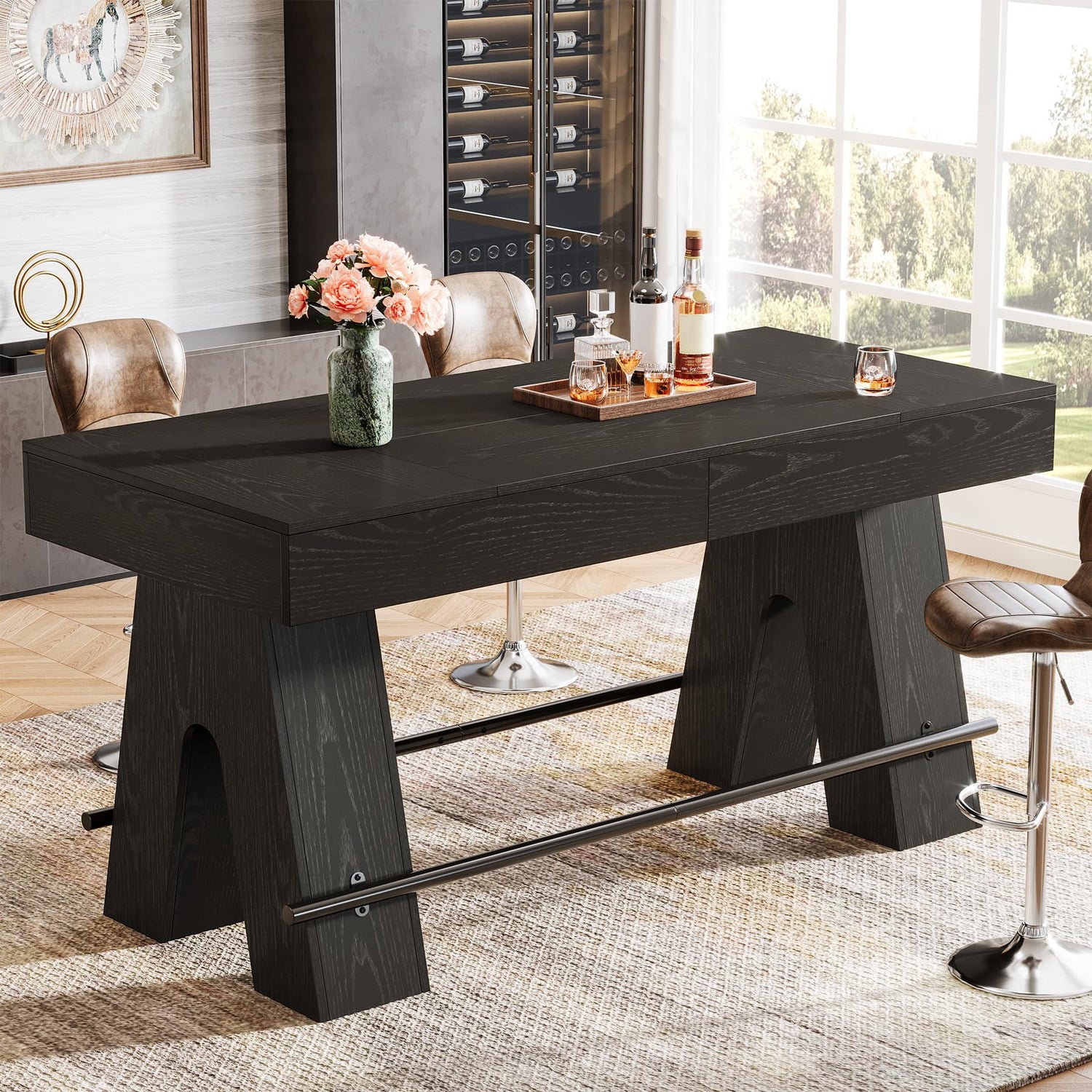 - Large Bar Table: Measuring 63" W x 31.5" D, the generously wide tabletop ensures ample space for food and entertainment. Enjoy fine drinks, relish good food, immerse and engage in relaxed conversations around our pub tables in bar height