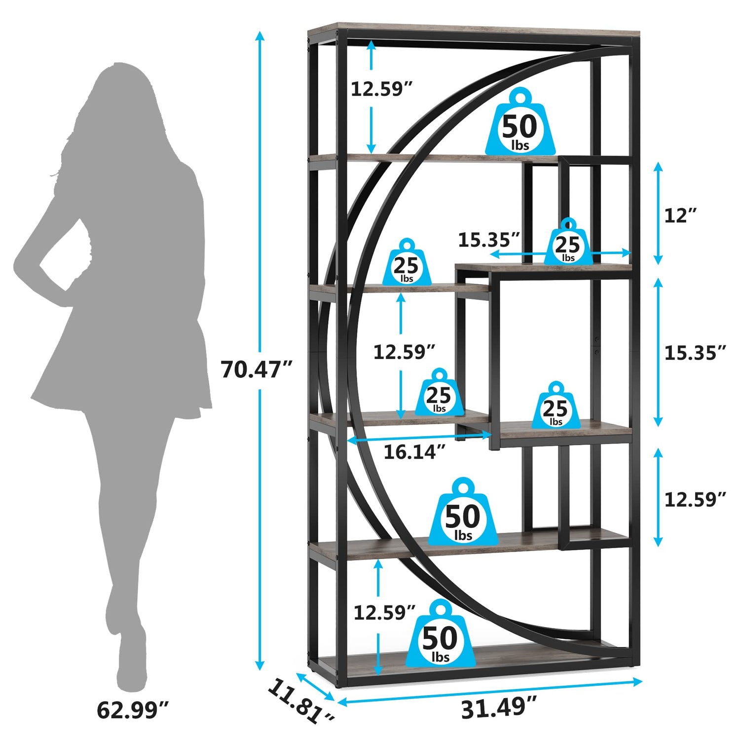 This bookcase showcases a striking geometric design, adding an air of elegance and sophistication to any room. The harmonious contrast between the black metal frame and the grey wood finish creates a sleek, chic aesthetic that complements a variety of décor styles, making it a beautiful addition to your interior.