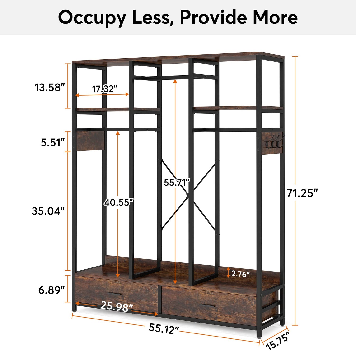 Tribesigns Clothes Rack for Hanging Clothes, Wardrobe Closet with 2 Drawers, Heavy Duty Garment Rack with Shelves and 6 Hanging Hooks, Freestanding Closet Organizer for Bedroom, Laundry, Rustic