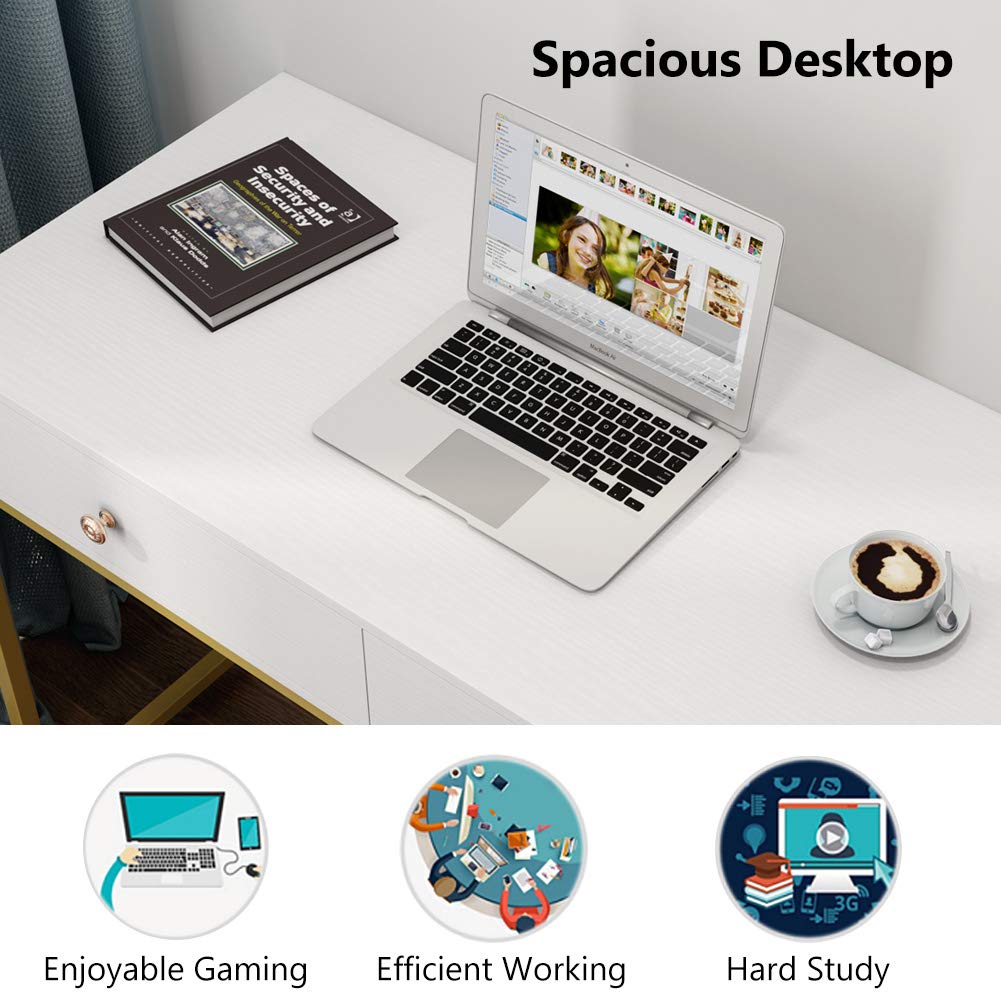 Tribesigns Computer Desk, Modern Simple 47 inch Home Office Desk Study Table Writing Desk with 2 Storage Drawers, Makeup Vanity Console Table, White and Gold
