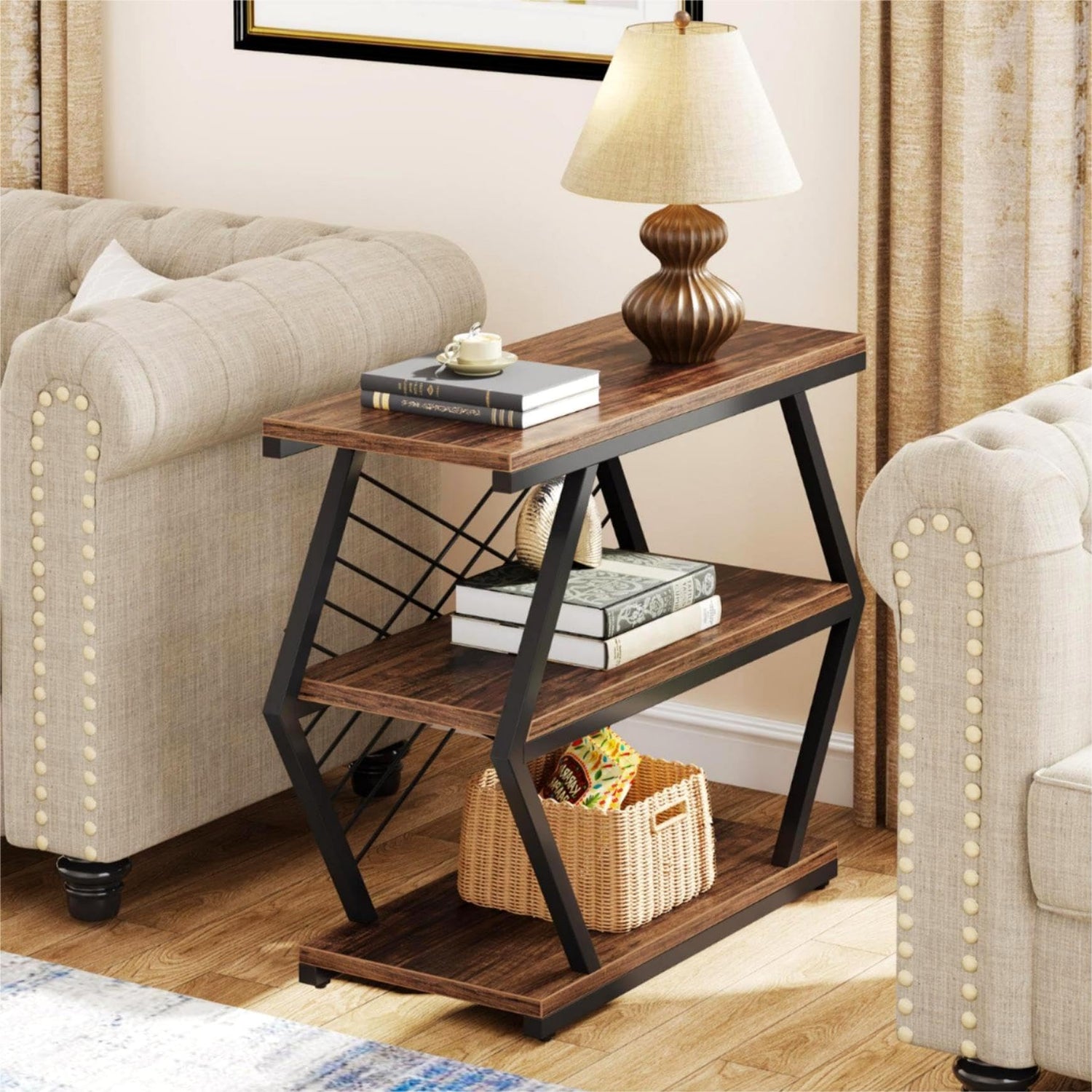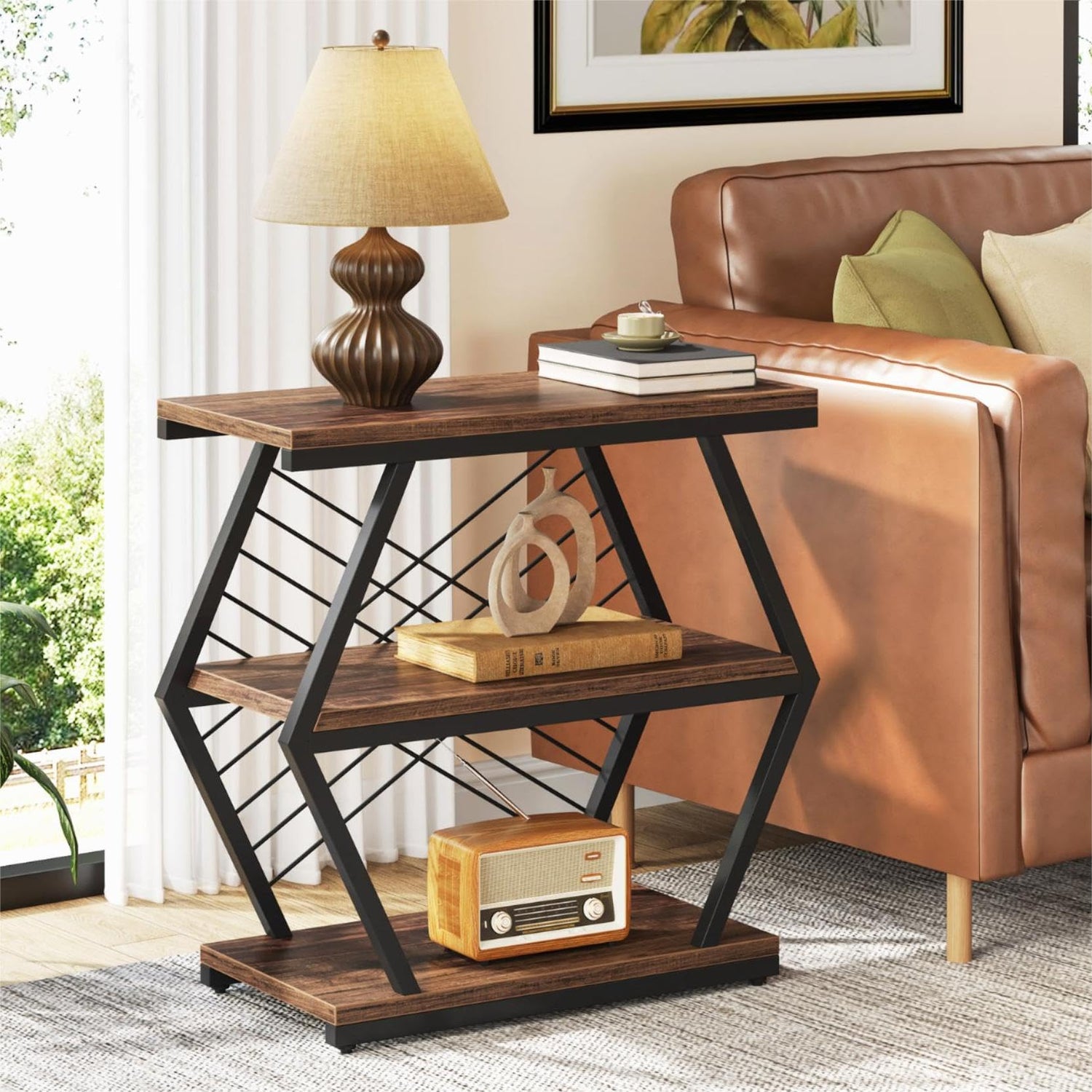 Tribesigns End Table, Industrial Side Table with 3 Storage Shelves, Wood Sofa Side Table with Geometric Metal Frame, Bedside Table for Living Room, Bedroom (1PC, Rustic Brown)