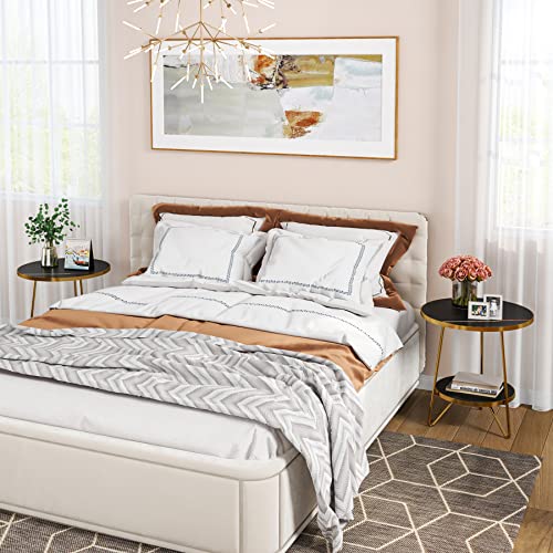 Tribesigns Faux Marble End Table, 2 Tier Round Side Table with Shelves, Modern Black Nightstand Bedside Table Small Coffee Accent Table for Living Room Bedroom, Black and Gold