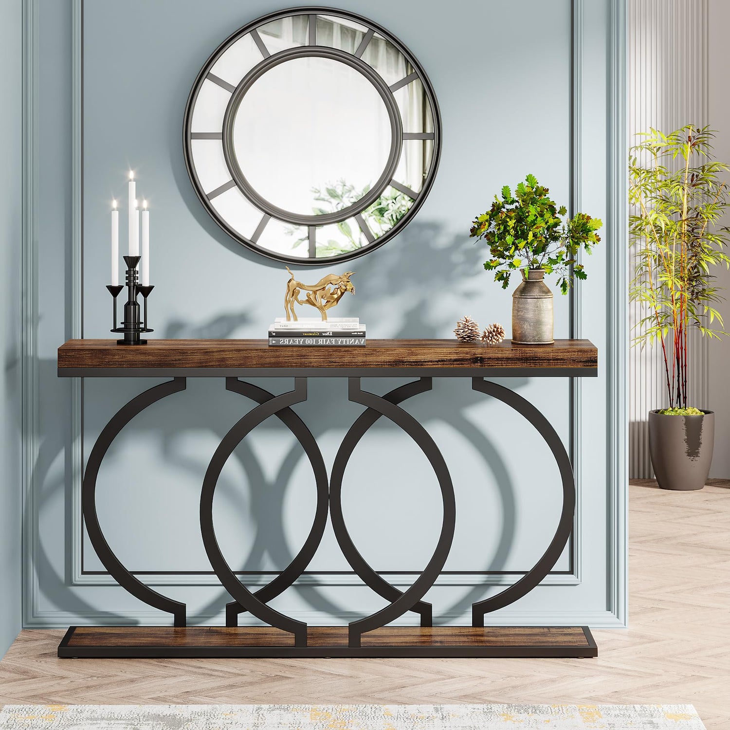 - 【A Real Eye-Catcher】-Dive into industrial charm with this rustic brown entryway table! Integrating an brown texture and striking geometric black metal base design this minimalist sofa table adds a clean and minimalist touch to your home. Set a sophisticated first impression in your foyer with this console table.