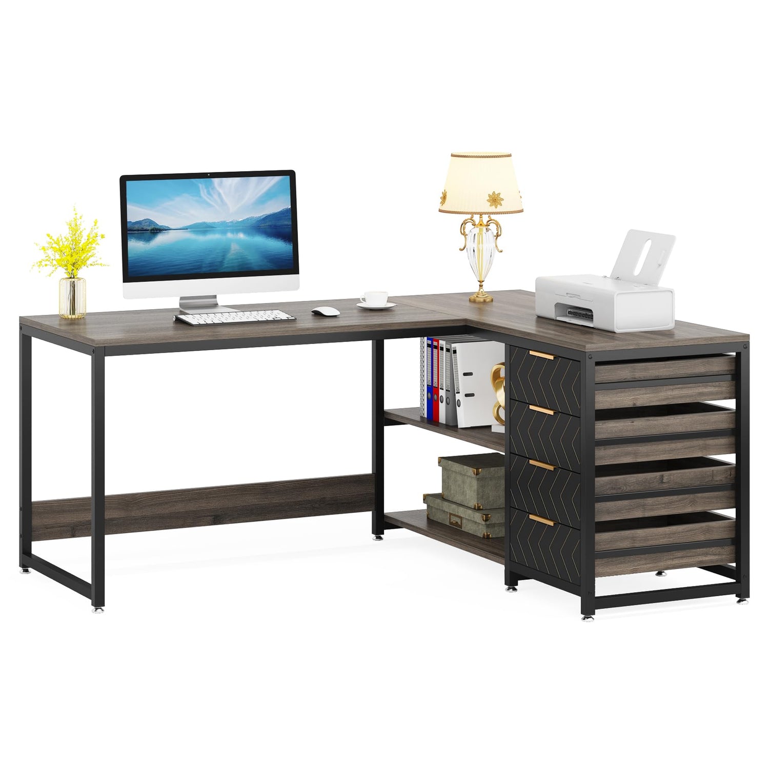 - Multi-functional L Shaped Desk: Brimming with industrial charm, grey veins panels and black frame, grey drawer finish for a decorative touch, which can be blended with any scene of your home office. Served well as a computer table, home office desk, study table, writing desk or executive desk...