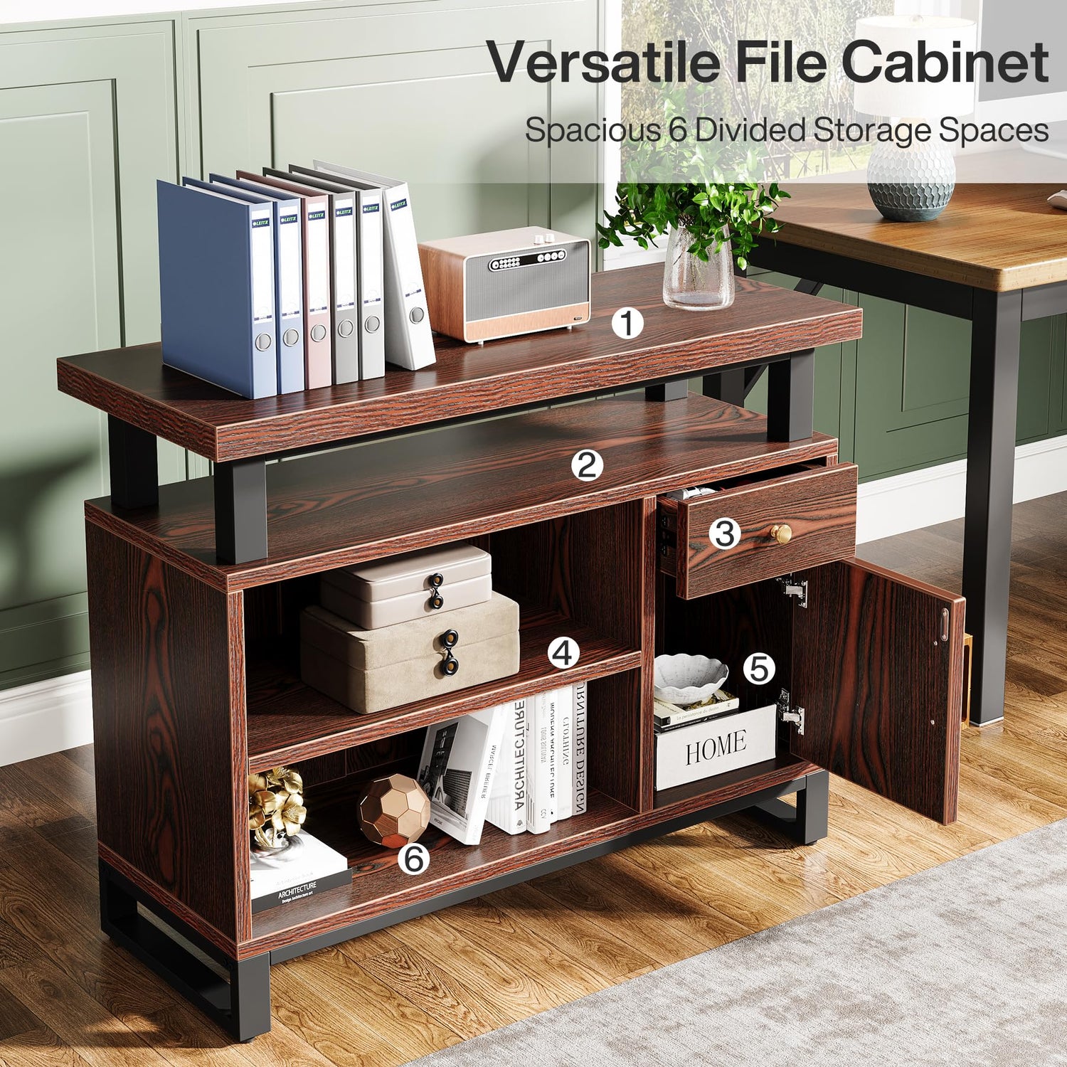 - Multifunctional File Cabinet: Measuring 39.37" W x 15.75" D, this storage cabinet designed with 4 open shelves, a drawers and a closed-door cabinet. Its multipurpose shelves, drawers and cabinet provide ample space for your different storage needs. Books, documents, printer, scanner, or fax machine, all of these will assure an organized and effortless accessibility. This reversible cabinet can be positioned on the left or right, best optimize office space utilization.