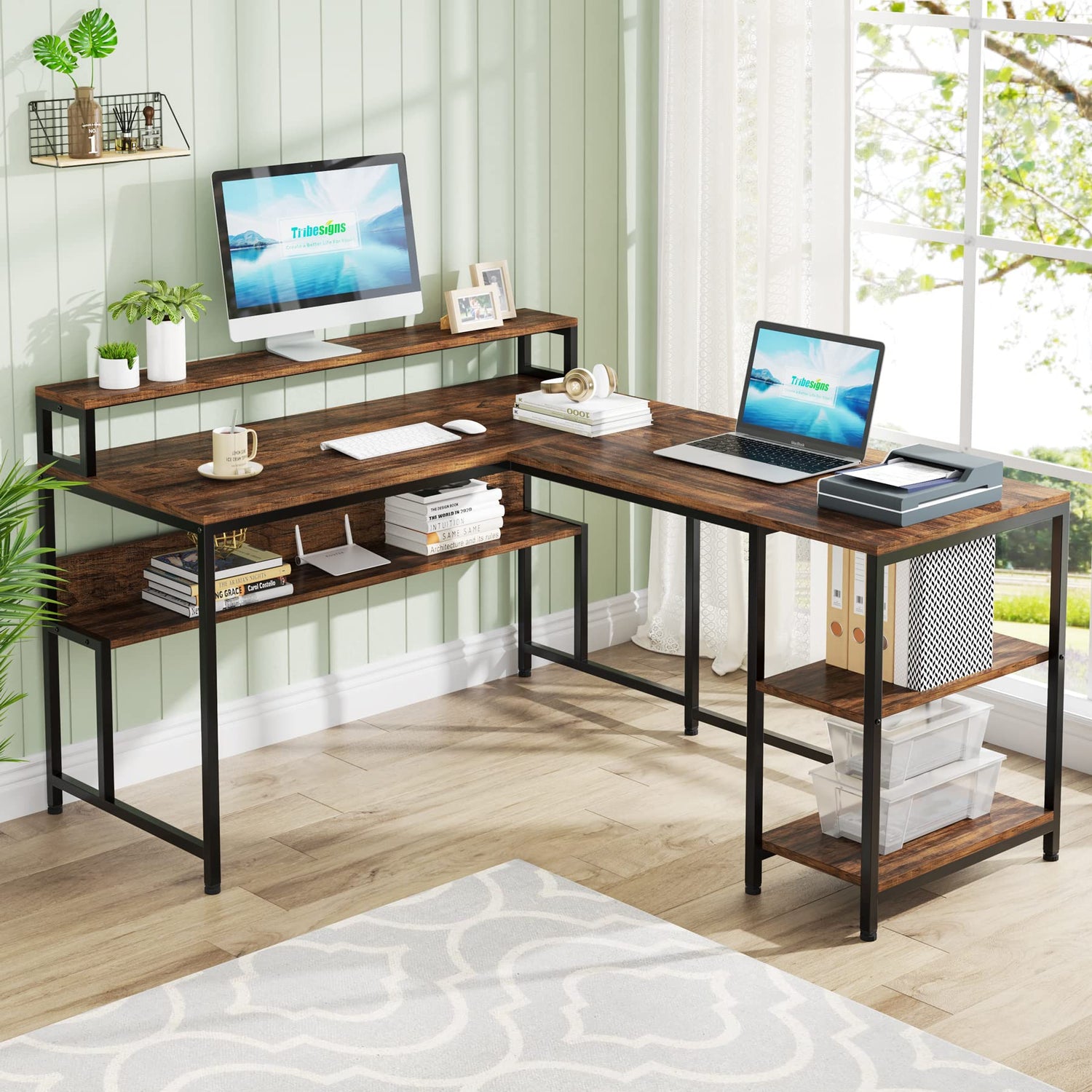 Tribesigns L Shaped Desk with Shelves, 59" Large Corner Computer Desk with Monitor Shelf, Reversible Home Office Desk with Bookshelf and Metal Frame, Two Person Desk, Rustic Brown