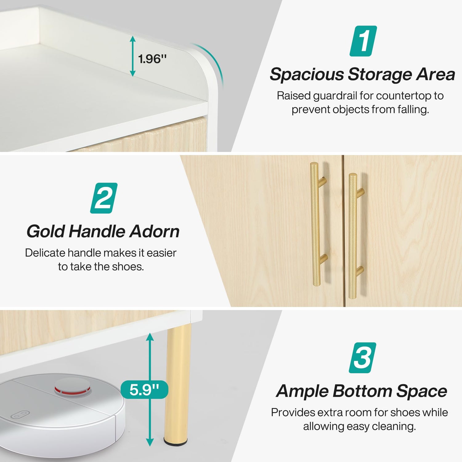 - 【RELIABLE STRUCTURE】Crafted with high-quality particleboard and high metal legs, the white shoe cabinet is sturdy and stable enough to support up to 220 lb and last for years to come. Smooth gold handles are easy to grip, making opening the cabinet easier. Toppling-preventing devices are included for added security; four adjustable feet protect the floor from scratches.