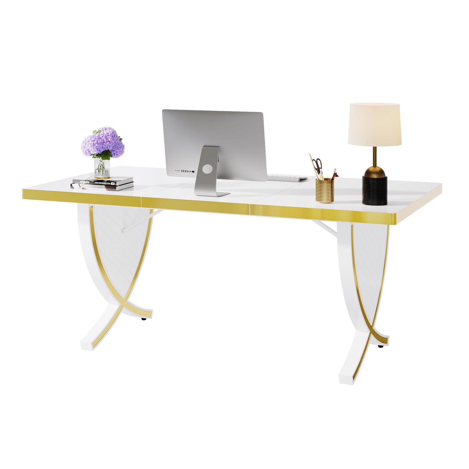 Tribesigns Luxury Modern Office Desk, White and Gold Large 63" Workstation, Elegant Executive Desk with High-Gloss Finish, Sturdy Metal Legs, Perfect for Home Office or Study