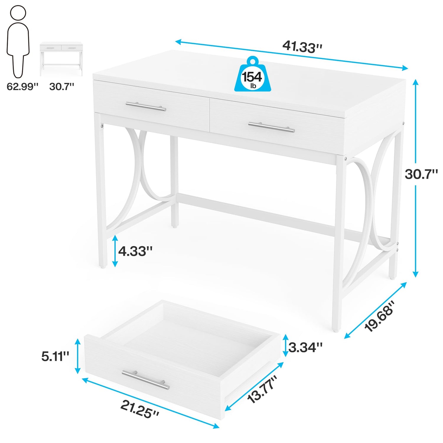 Tribesigns Modern Computer Desk with 2 Drawers, 41 Inches Study Writing Office Desk for Home Office, Bedroom, Makeup Vanity Table Desk with Metal Frame, White