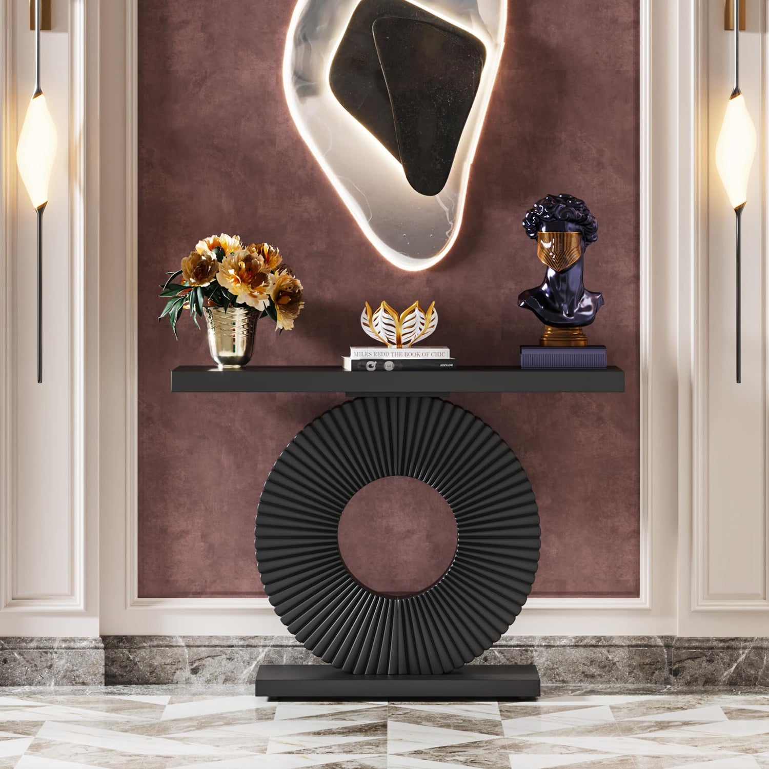 - ✔【COMBINATION OF FUNCTION & STYLE】This contemporary console table showcases an circular flower shape base with curved lines accents that pair seamlessly with clean tabletop for a minimalist glam look. With a striking geometric design for a touch of impeccable style, this table will be sure to enliven any space. From an entryway to living room and beyond, the entryway table offers room to display decor pieces while also clearing up clutter.