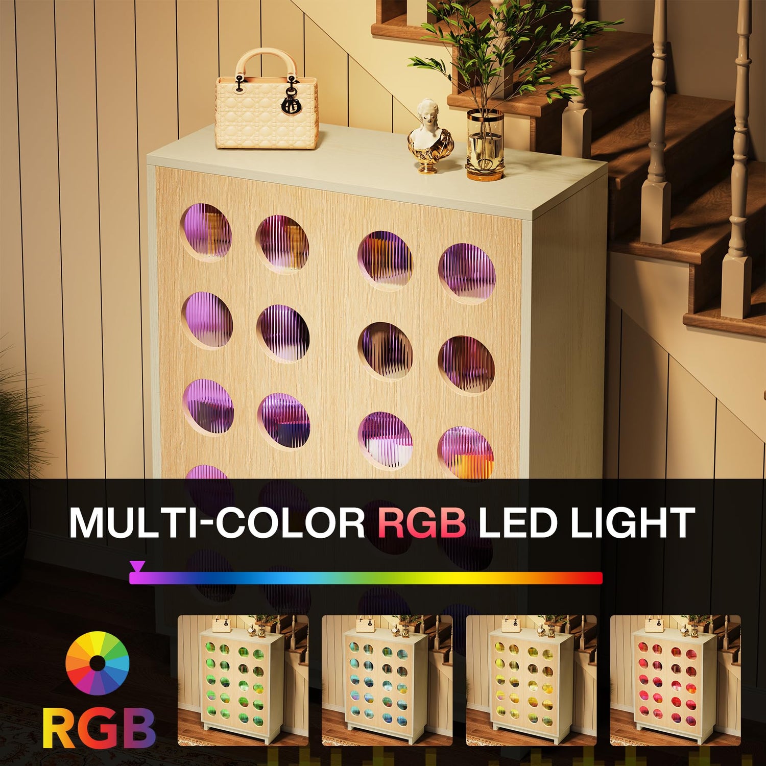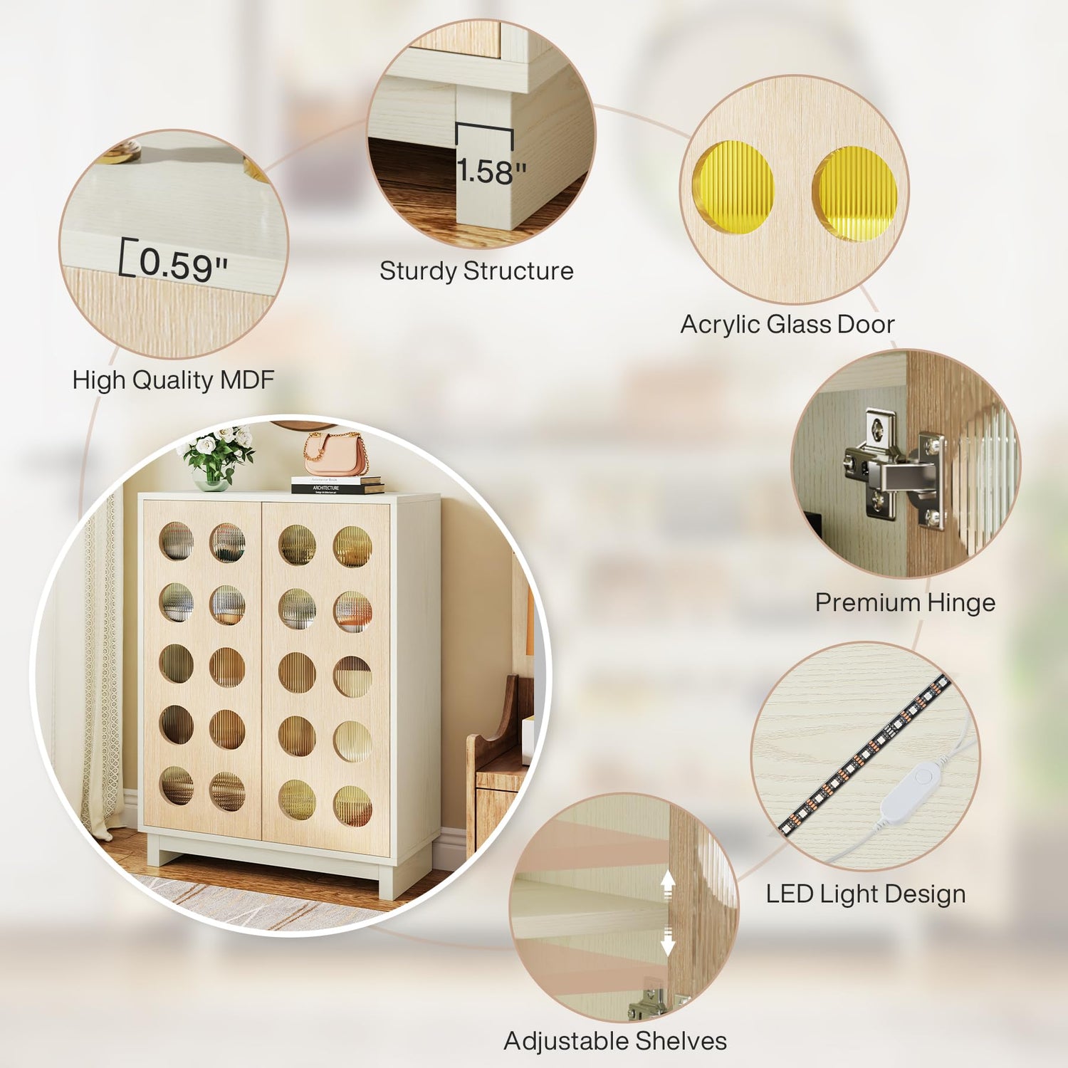 - Charming Elegant Style: The shoe storage cabinet combines classical and stylish design with delicate acrylic glass doors and a decorative natural wood finish. The beautiful multi-color RGB LED backlight adds a unique and luxurious touch to your space. Easily clean the smooth and flat surface with a damp or dry cloth.