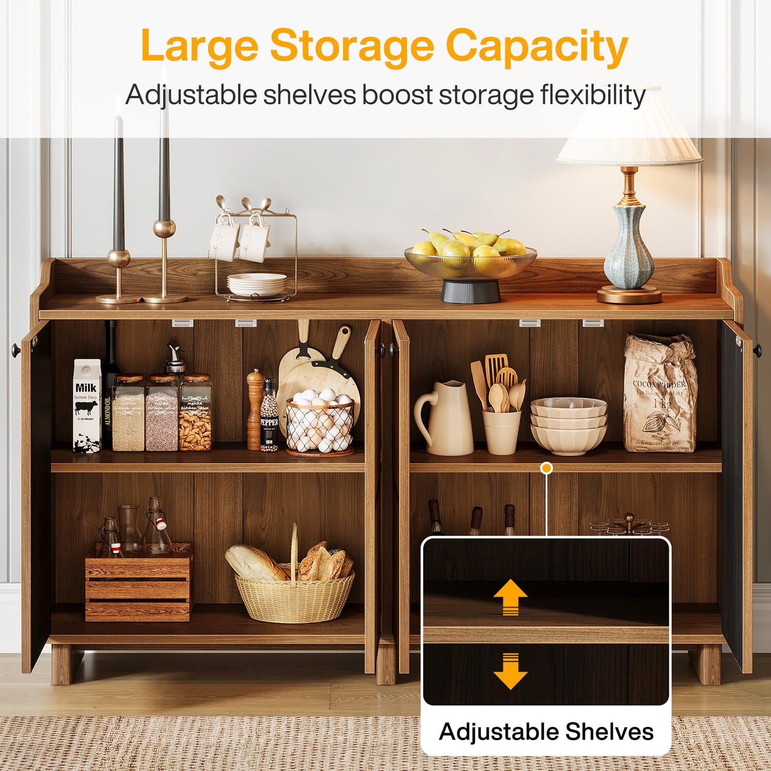 - Ample Storage Space: Effortlessly tidy up your messy kitchen or dining room tableware with this wood sideboard, furnished with a four-door cabinet to neatly tuck away all your essentials. Its spacious tabletop can house a coffee machine or oven, while the internal storage space, equipped with two adjustable shelves, allows sorted storage for tableware, plates, wine bottles, and cereals