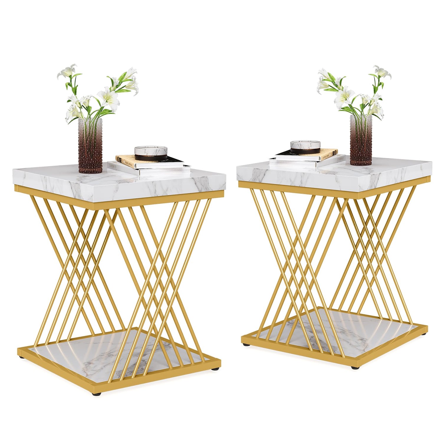 Tribesigns Square End Table White Gold 2-Tier Side Table Modern Small Bedside Table with Storage for Couch, Sofa Side Table with Stylish Metal Frame for Living Room (2, Faux Marble White+Gold)