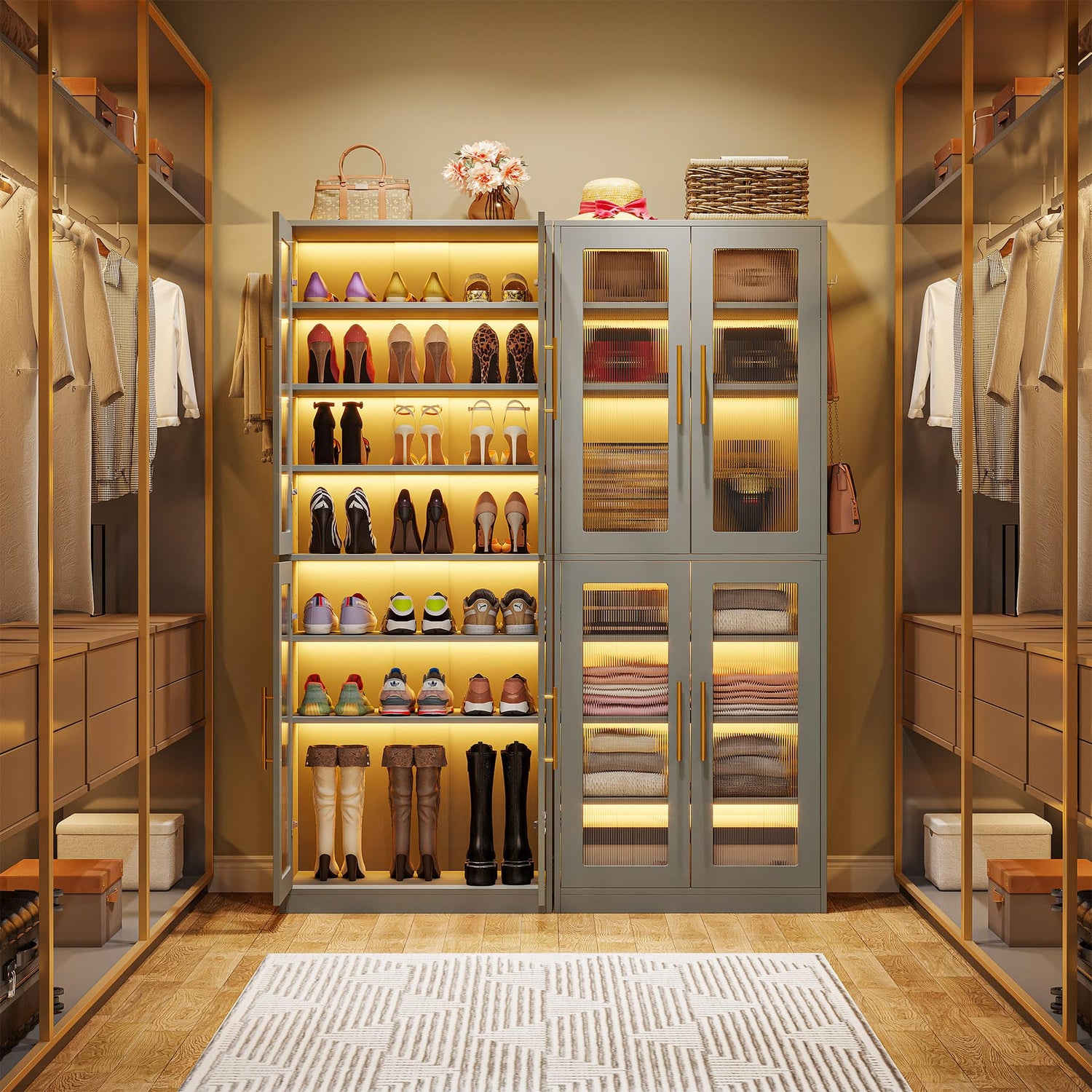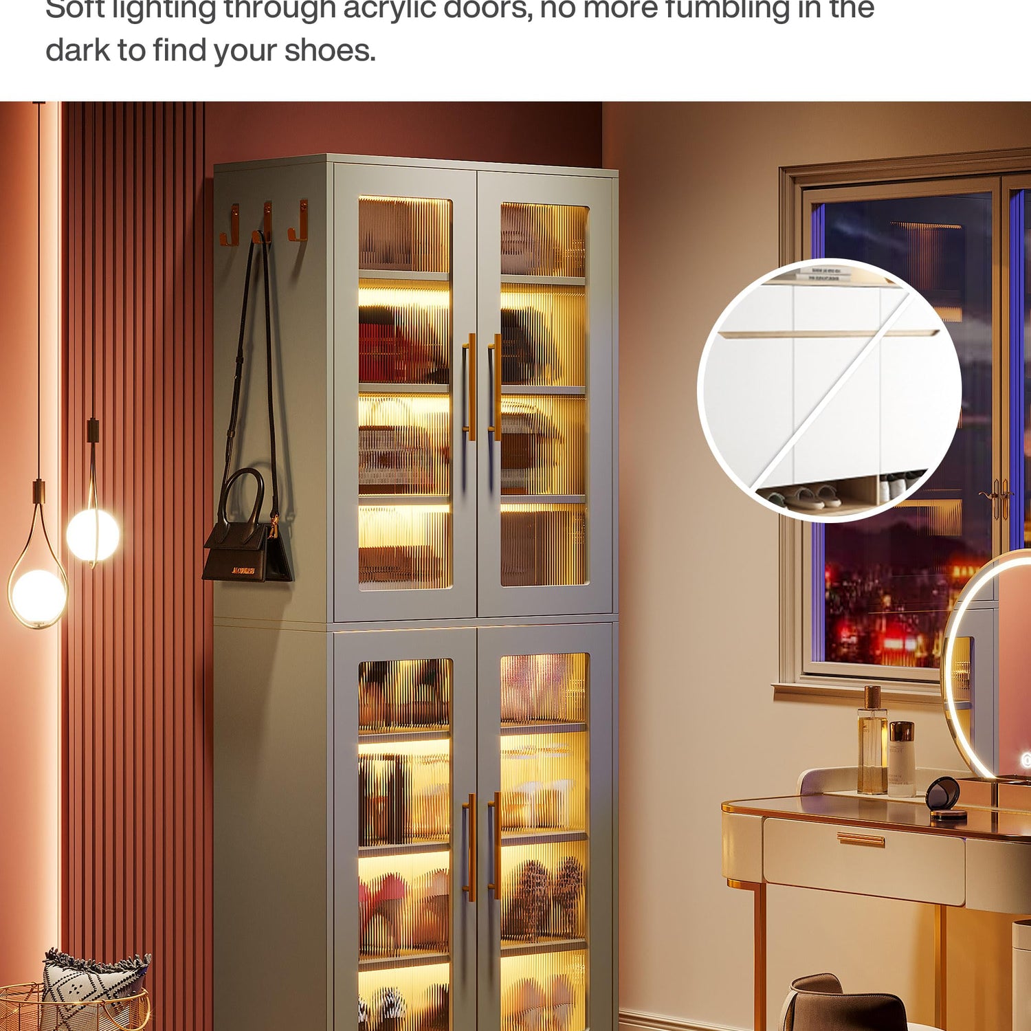 - 【Shoe Rack with Acrylic Doors】: The acrylic on the freestanding shoe cabinet is tempered, meaning it is not easily broken during transportation. The soft lighting behind acrylic doors exudes an open feel and makes your space more attractive. This also saves you from searching in the dark.