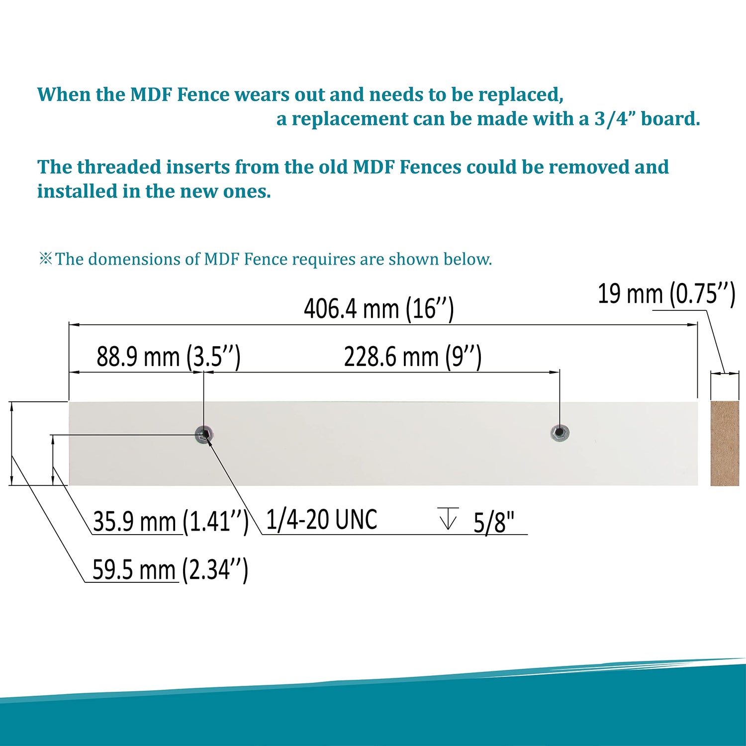 - The aluminum fence is 2-5/16” tall, and 1-1/16” thick. The length could be extended to 24” from 16”. The MDF sacrificial fence provides extra length to support the cut line on both side.