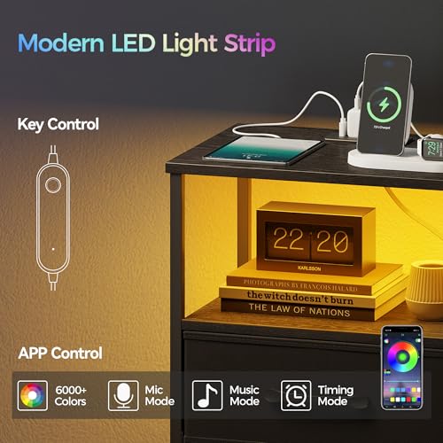 TRIFEBLE Nightstands Set of 2, Night Stand with Charging Station and Led Lights, Bedside Table with 2 Fabric Drawers for Bedroom, Small Side End Table with Open Shelf, Black