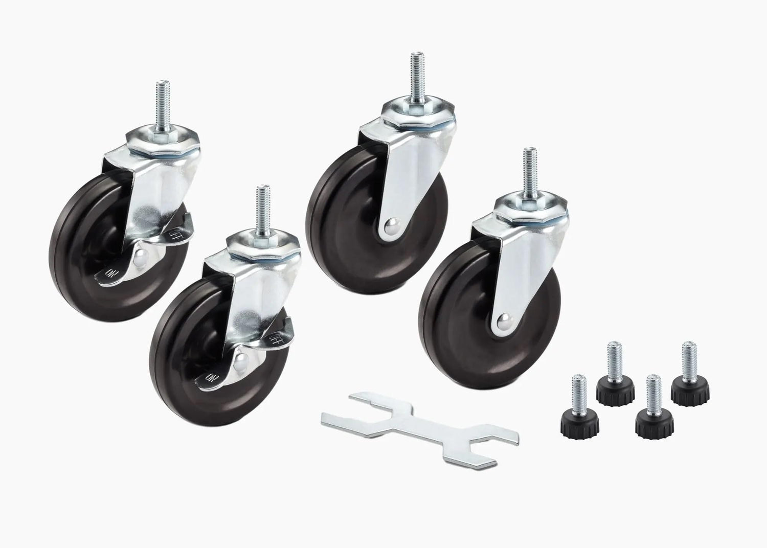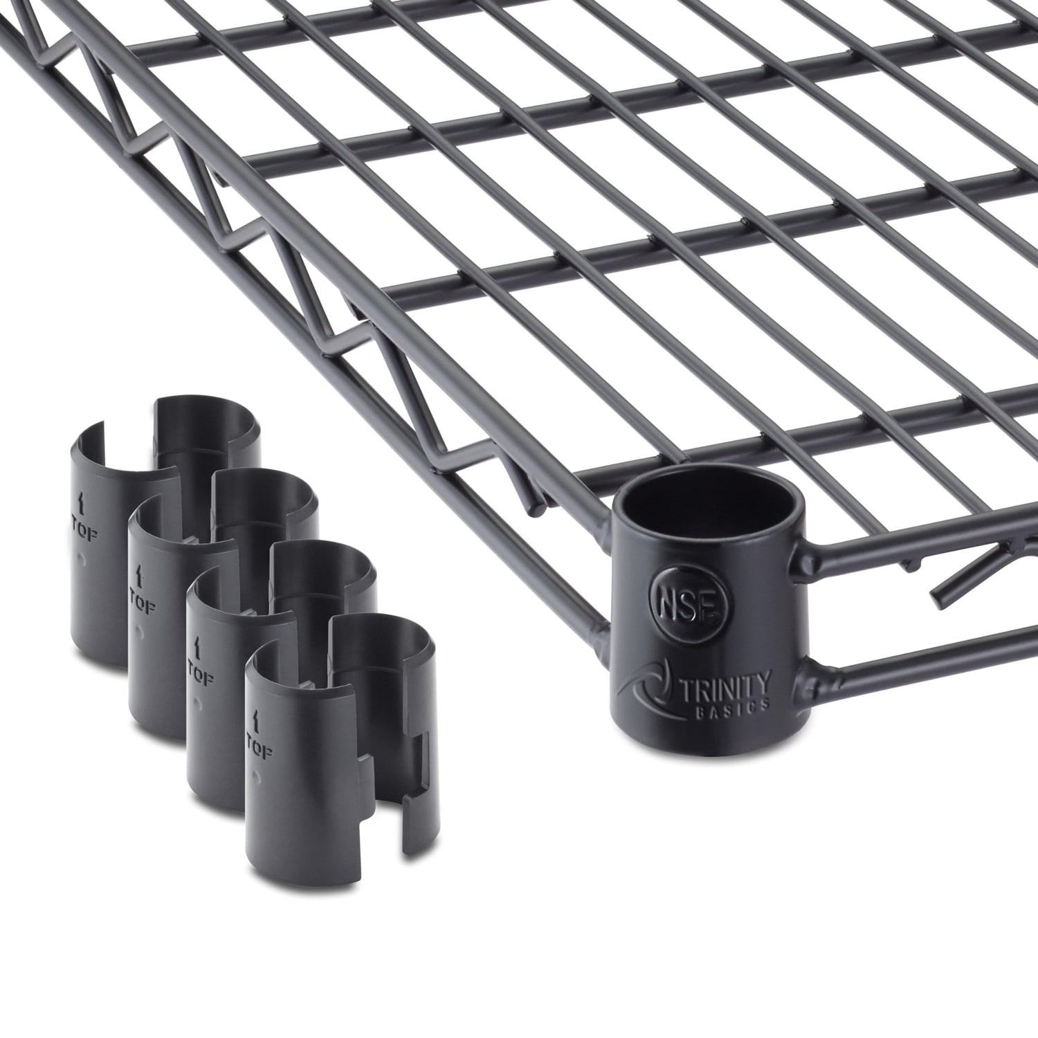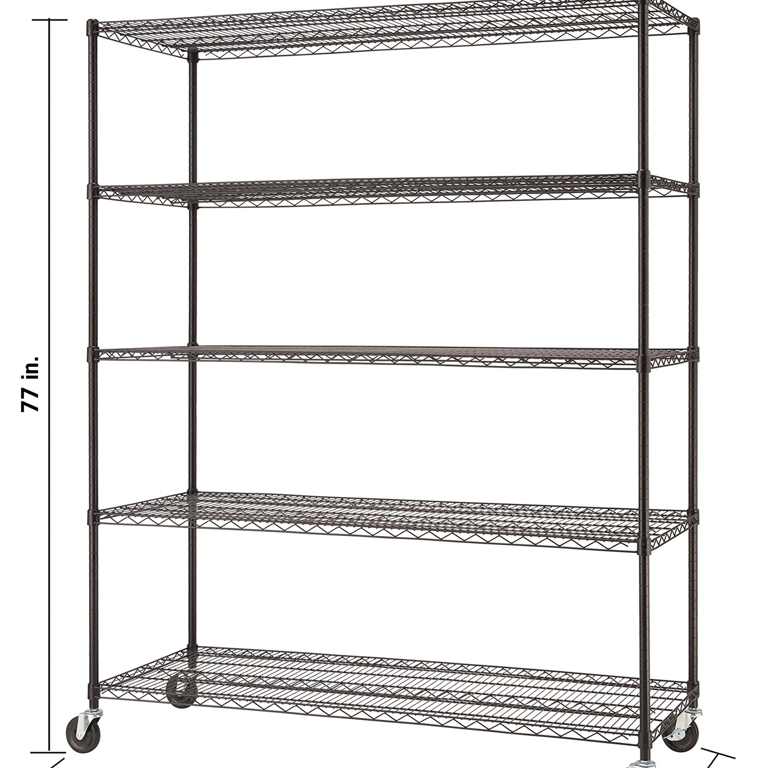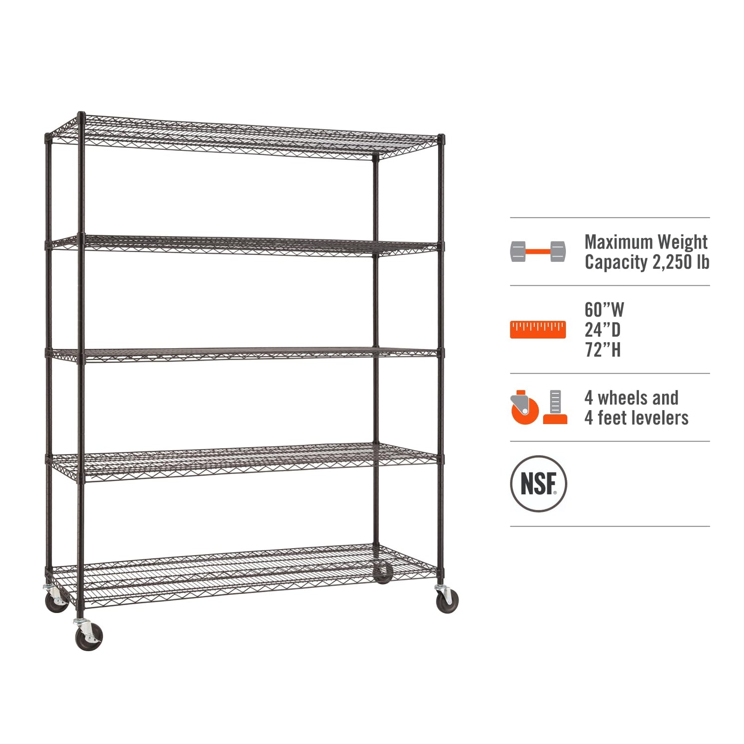 Details: TRINITY BASICS NSF certified 5-tier wire shelving rack is ideal for any business, home, garage, or kitchen use. With a 450 lb weight capacity per shelf on feet levelers, it can hold your large, heavy boxes, oversized items, and everything in between. Assembly requires no tools and uses a slip-sleeve locking system, which adjusts shelves in 1-inch increments. Mobile & Stationary Options. Includes (2) Locking and (2) Non-locking Wheels. (2) Locking, and (2) Non-locking wheels for easy mobility of your stored items. Also Includes (4) Feet Levelers. Installing the feet levelers increases the total weight capacity of the entire shelving rack to 2,250 lb