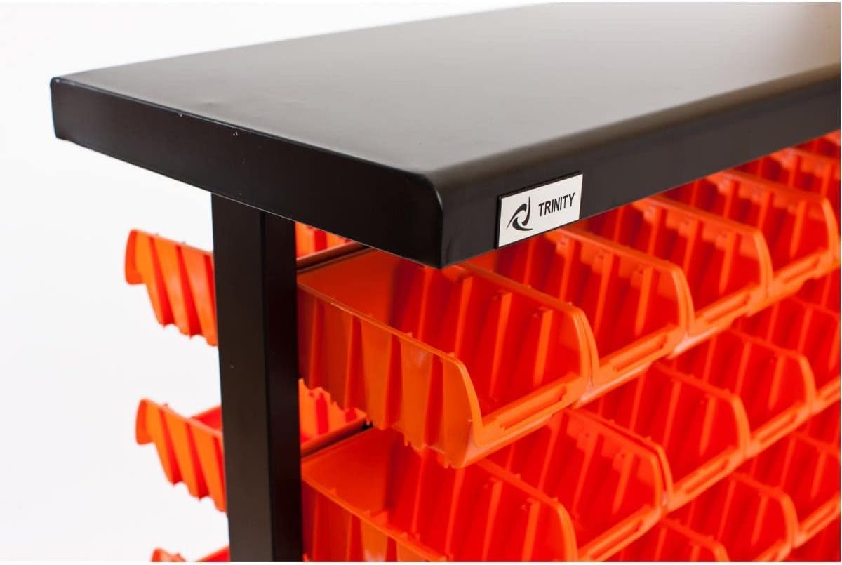 - MOBILE ORGANIZATION AND STORAGE: TRINITY’s mobile bin rack is versatile and can be used for garage storage, office organization, and more; The storage rack is dual-sided for maximum storage space and easy access to tools, small items, and supplies