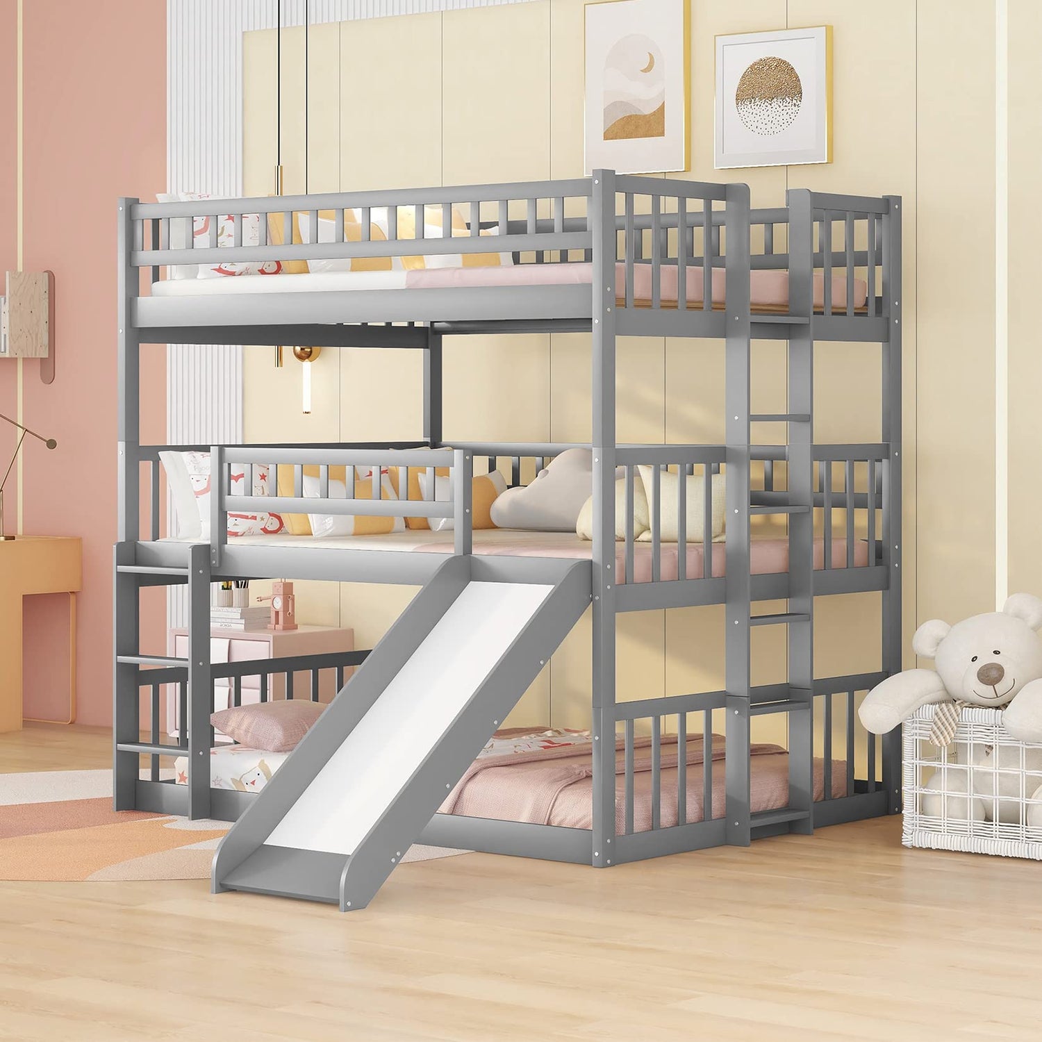 Triple Bunk Bed with Slide, Full Over Full Over Full Bunk Bed Convertible Triple Beds for Kids/Teens/Adults, Gray