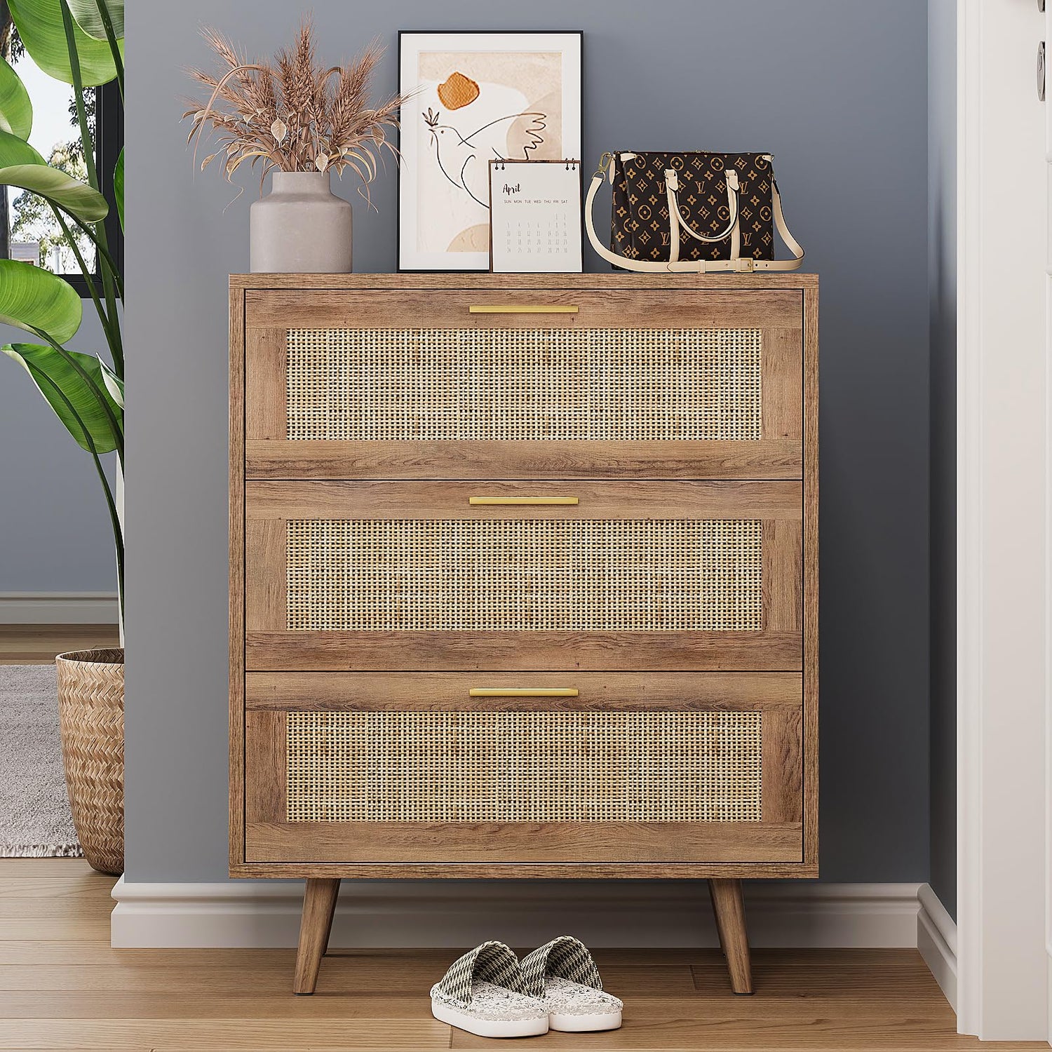 Trironsun 3 Drawer Dresser for Bedroom Rattan Dresser Chest of Drawers with Spacious Storage Boho Clothes Storage Nightstand for Living Room