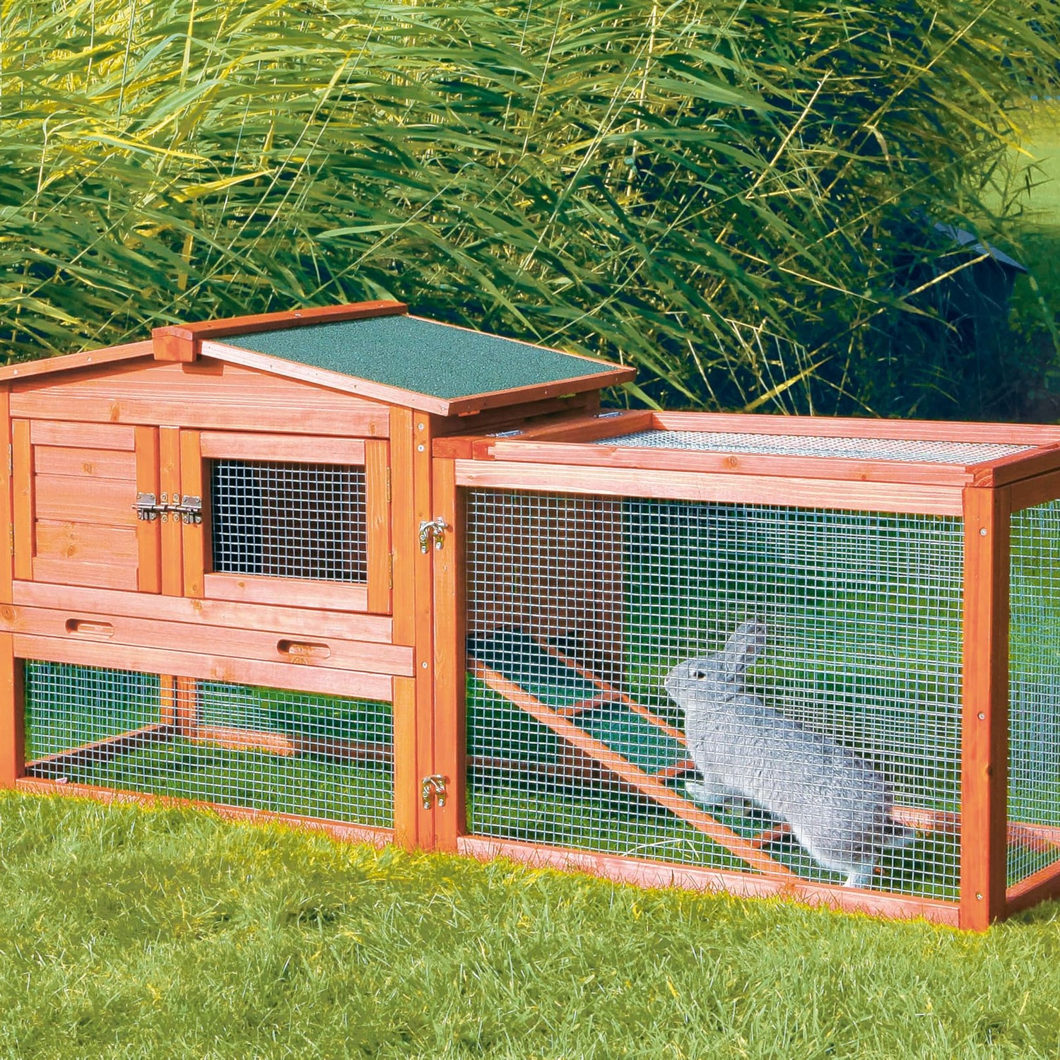 Details: Give your furry friend a wonderful home with this spacious outdoor rabbit hutch! The two-story design features a private retreat area upstairs and an attached run below for playtime. Your bunny can hop between levels using the non-slip ramp, while you'll love the easy-access hinged roof and pull-out tray for quick cleaning. This outdoor bunny house provides a great balance of shelter and space, making it ideal for rabbits and guinea pigs to live comfortably. Whether they're lounging in the upper level or exploring the run below, your pet will feel safe and happy in their new home.
