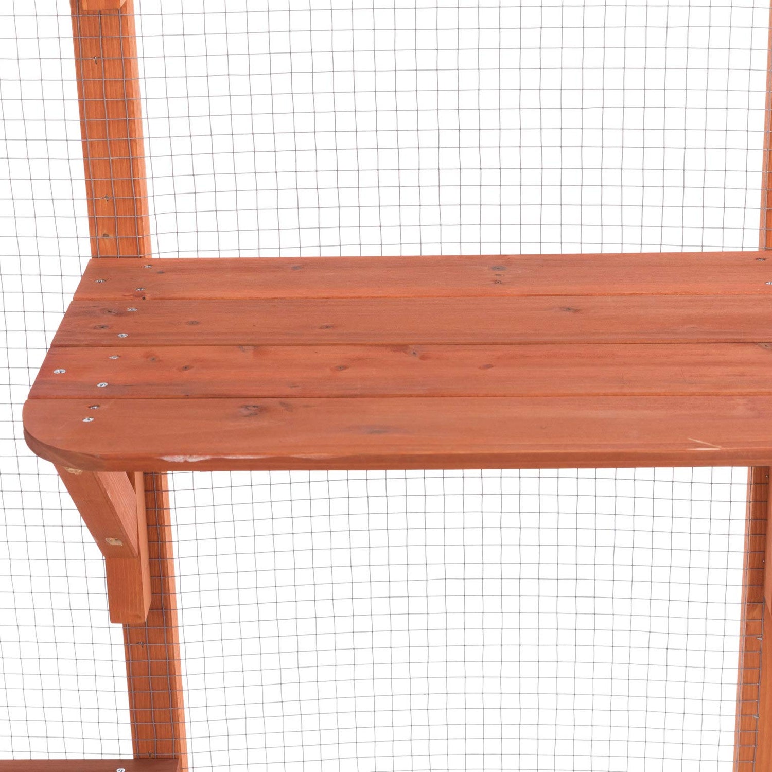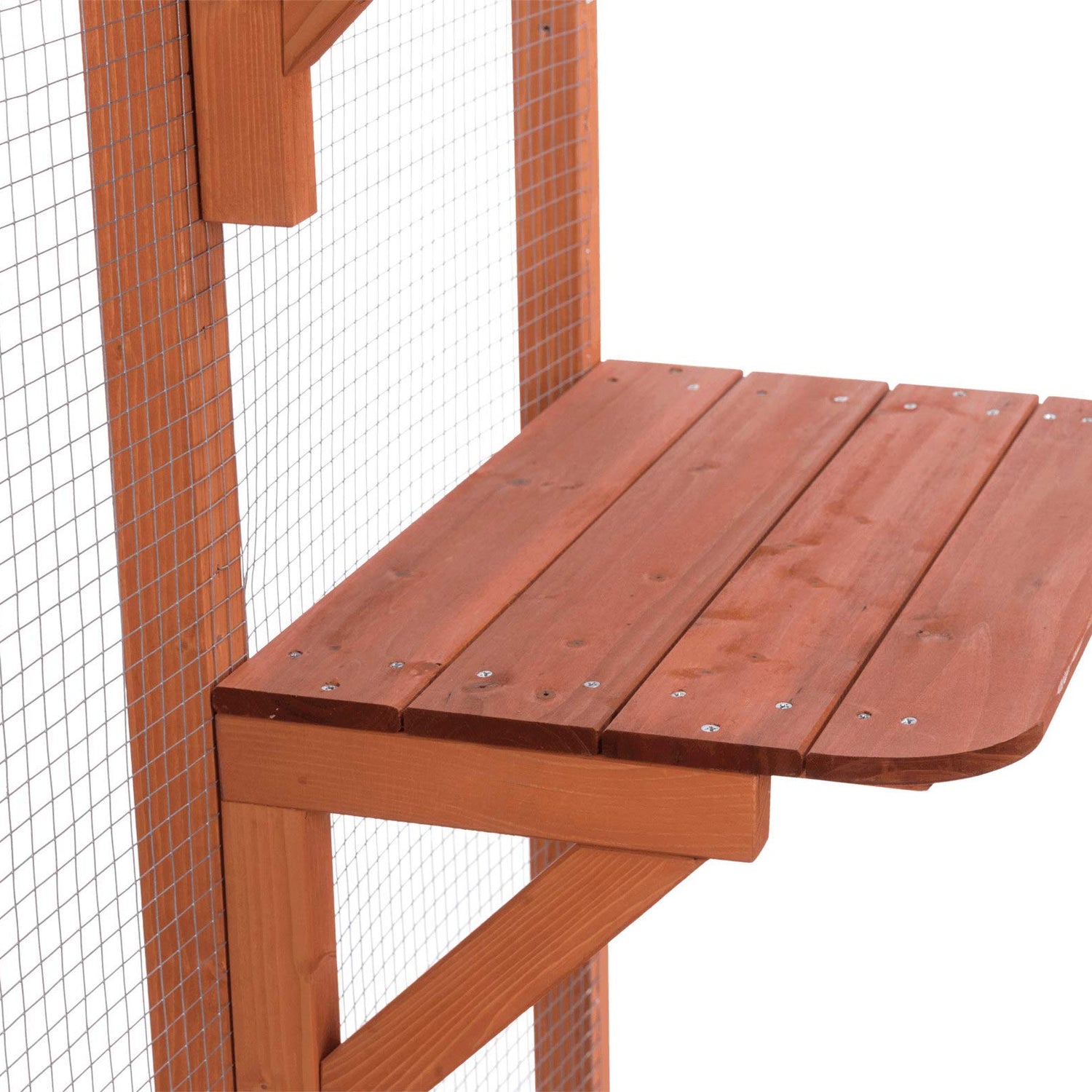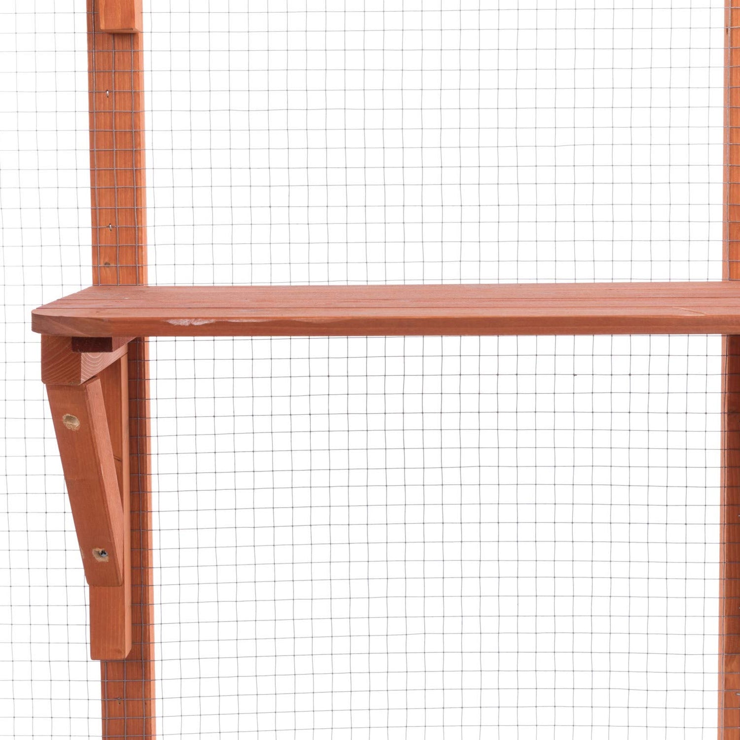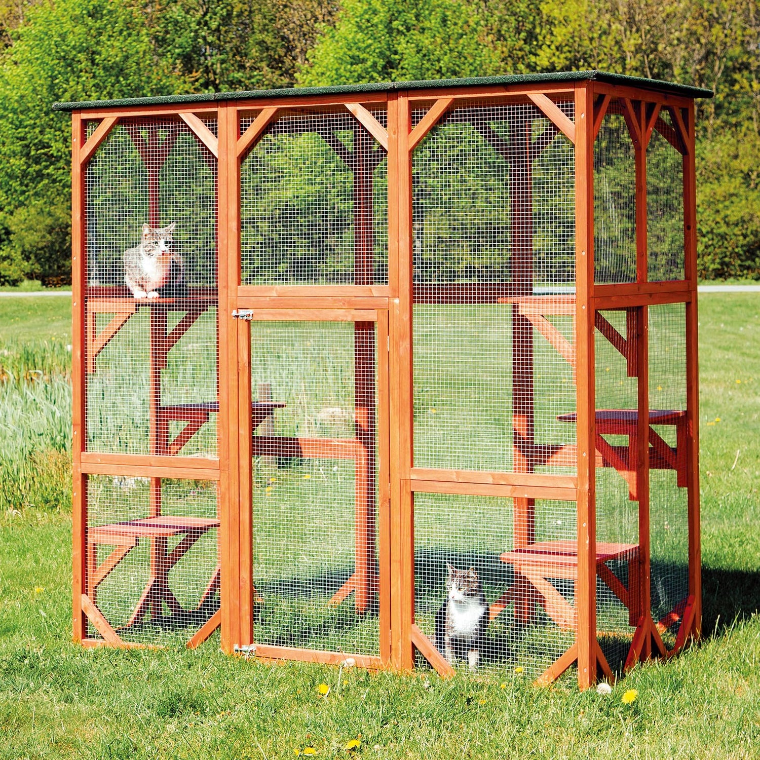 Details: Cats love spending time in the fresh air watching bugs, birds, and other animals. Our wooden outdoor cat sanctuary allows your cat to enjoy the outdoors while remaining safely enclosed. Use as a free-standing structure, or remove the back panels and attach it to your house or garage. Six large landing platforms provide your feline with plenty of options to Perch for a view or relax the afternoon away. Crafted with Fir, durable composite shingles, and a weatherproof finish means this product will endure years of use with very little maintenance. Includes 6 large landing platforms (17.75 x 11.75 inches). Large main door with metal latches (23.5 x 45.5 inches).