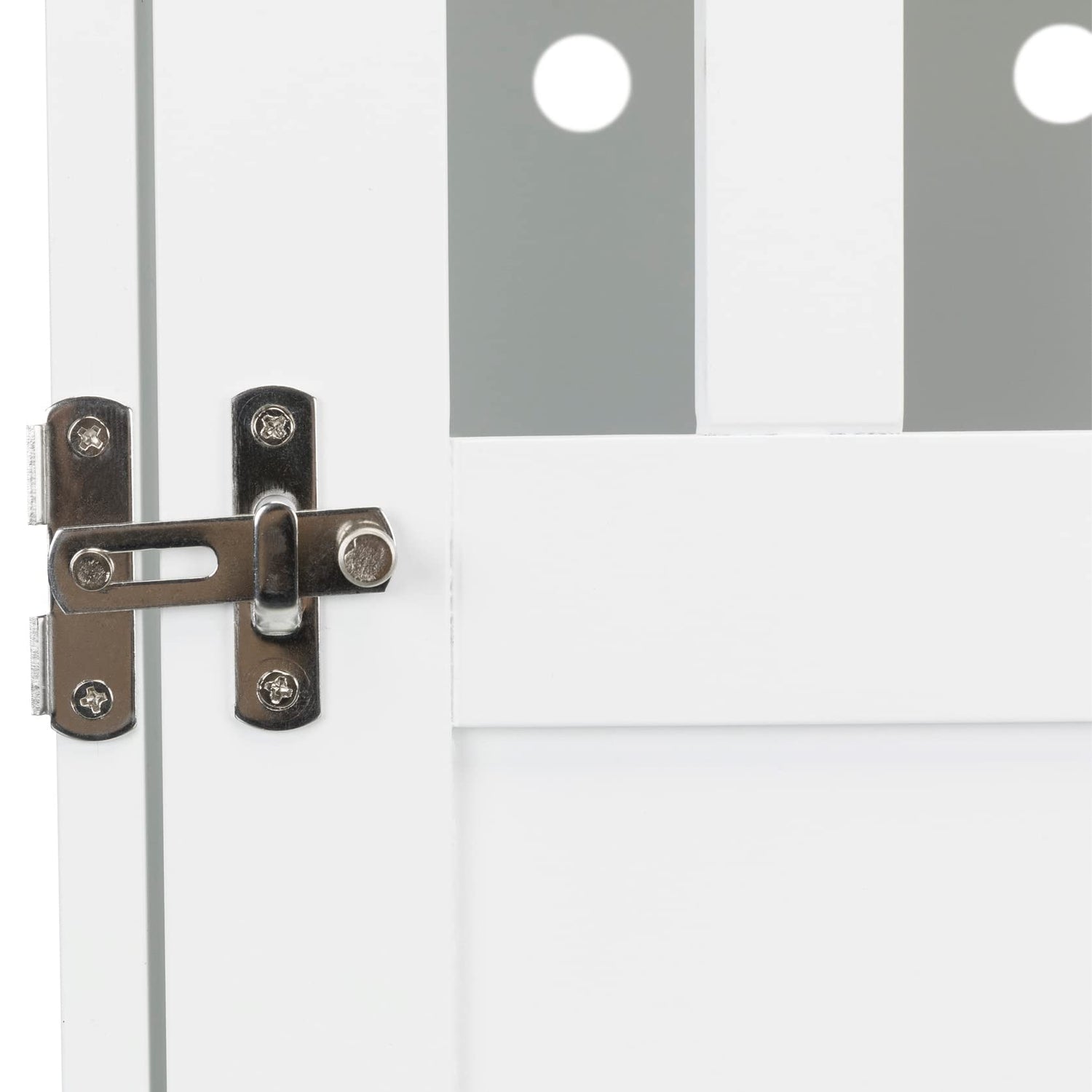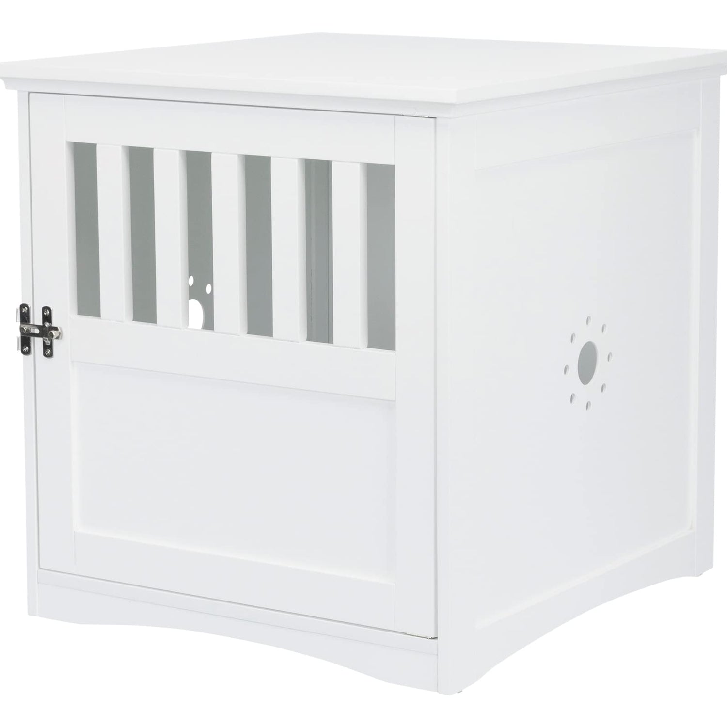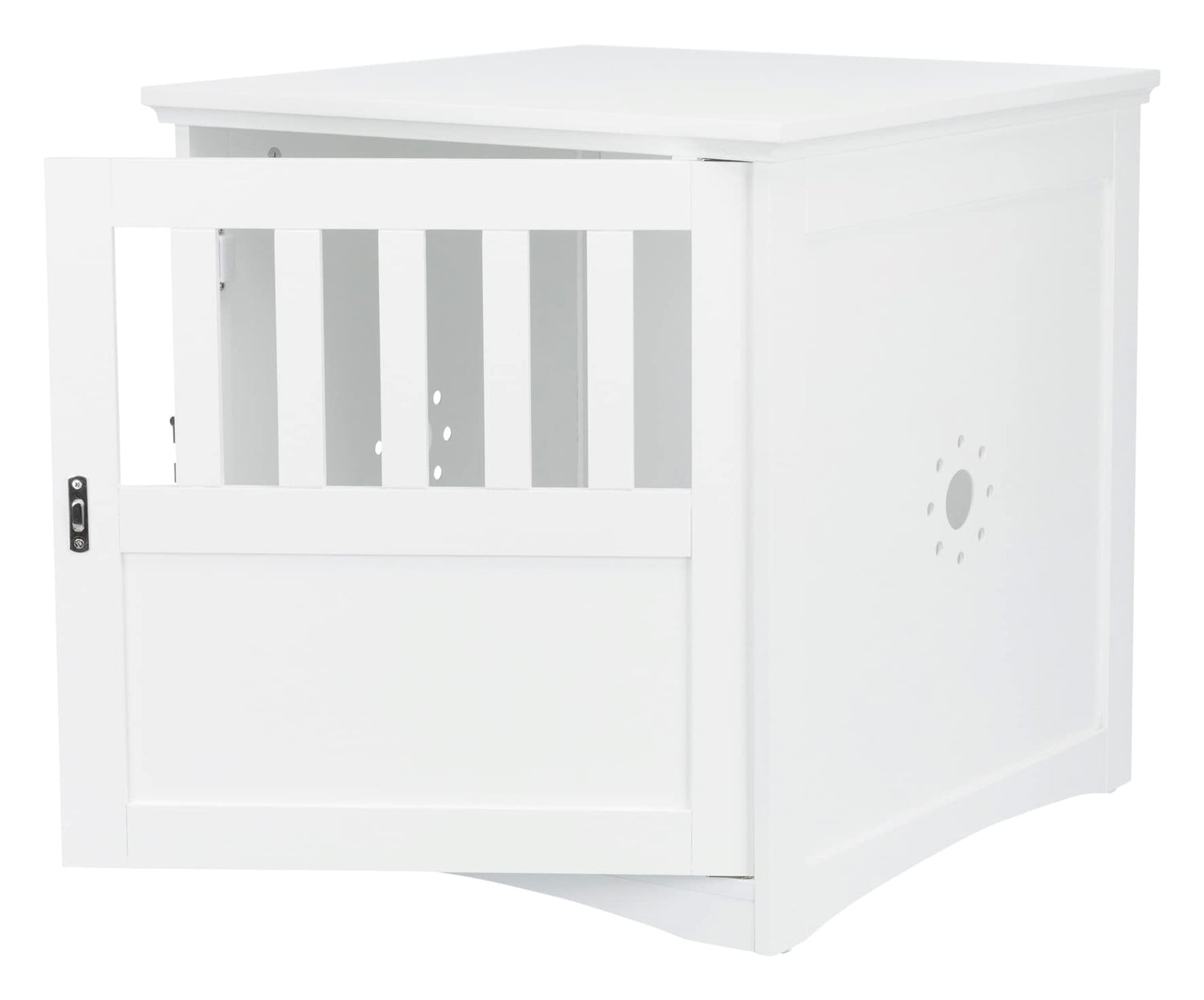 Details: The elegant TRIXIE Dog Home End Table for small dogs combines function and style to add warmth and comfort to any room in the house. The kennel doubles as a side table, end table, or nightstand. It allows your pet to have their own hideaway in your living room or bedroom. The pet crate is crafted with strong wood providing durability and a home that is built to last. Designed with four solid panels to provide a sense of security with ventilation holes to allow good air flow. The wood is crafted elegantly and painted with a crisp white providing a modern feel to any room. The wooden dog crate is equipped with metal hardware for securely locking the kennel door while providing a classy look. The doghouse is equipped with a wide tabletop perfect for magazines, potted plants, lamps, coasters, and drinking cups & glasses.