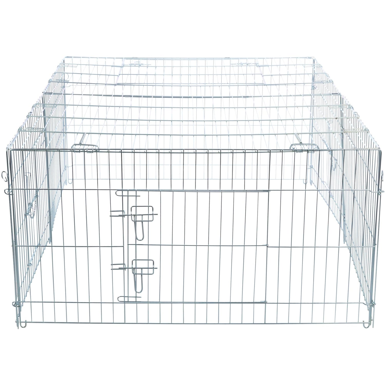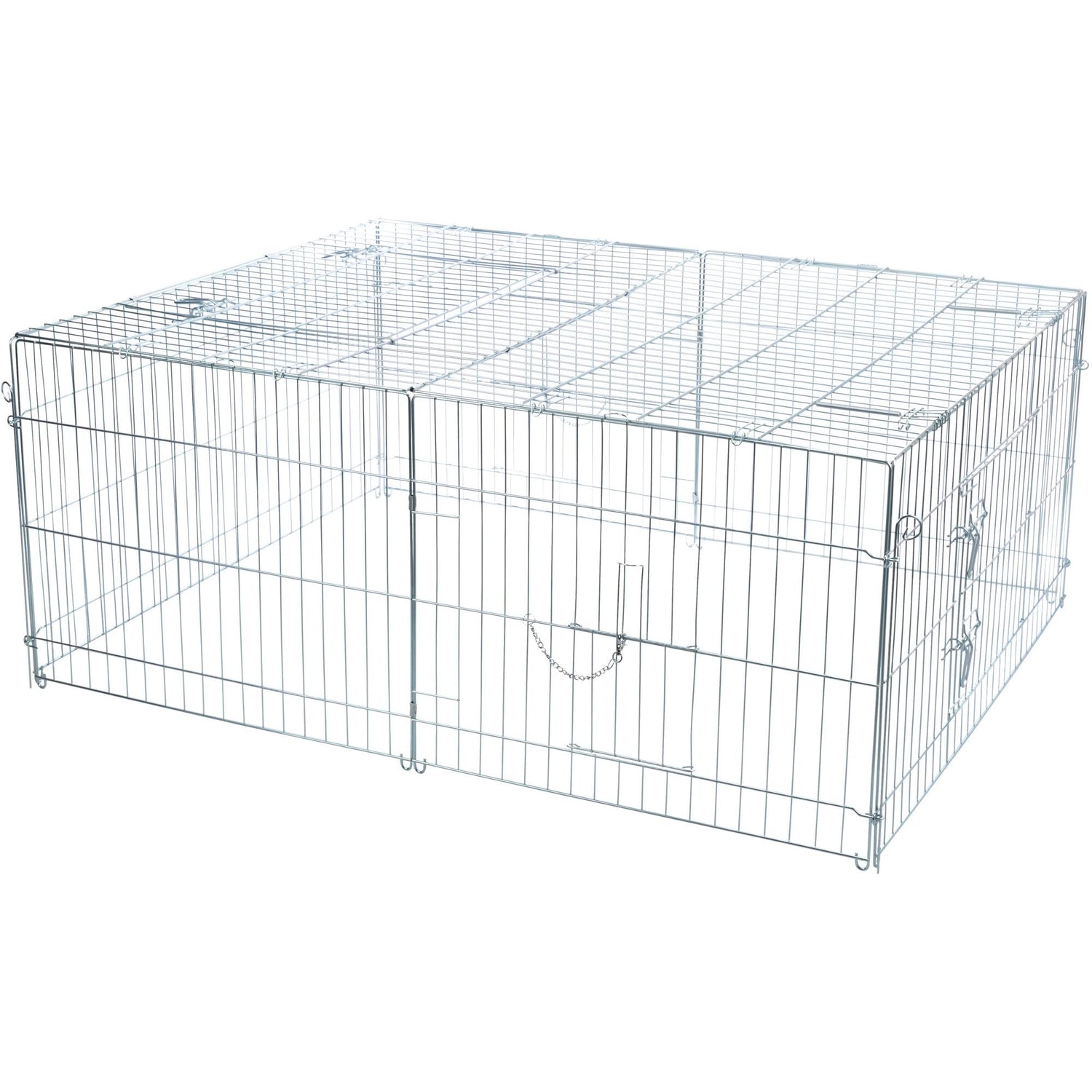 Details: The TRIXIE Enclosed Outdoor Run offers plenty of room for your pets to enjoy exercise, play, or lounge in the sun in a safe environment. It prevents small pets from getting loose and protects them from unwanted visitors. Made from durable, heavy-duty galvanized metal to ensure years of use with little to no maintenance. The playpen is light enough to be easily relocated when desired. Multiple entry points provide convenient access to the inside of the enclosure for feeding and care. Use alone or as an add-on to the TRIXIE Small Animal Homes (Models 62390 and 62391). Suitable for small pets, i.e., kittens, puppies, rabbits, guinea pigs, chicks, etc.