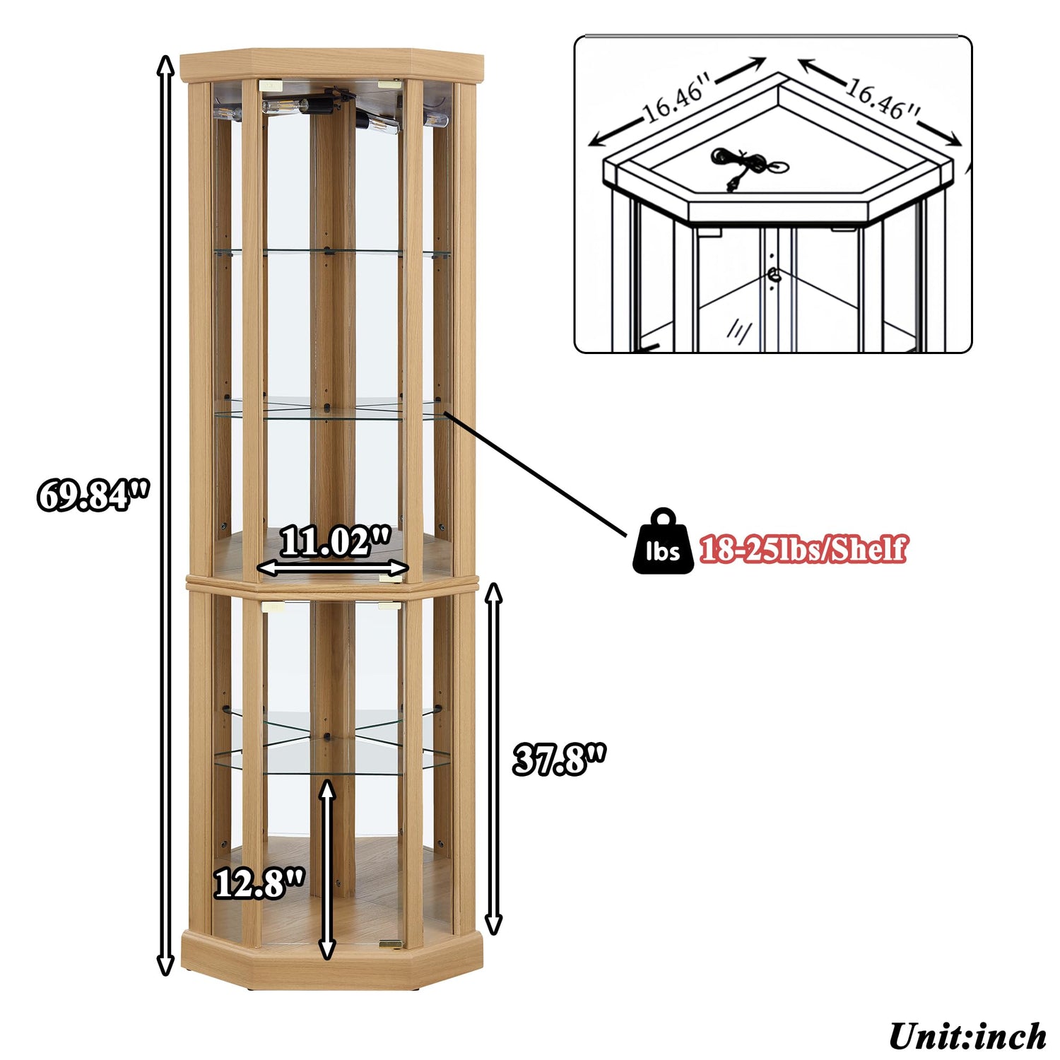 - 【Sophisticated & Classical Design】This corner glass curio cabinet with light is available in cherry, white, light oak, dark oak and black! Wooden Corner Display Case has excellent storage capacity and a gorgeous look. Wooden corner display cabinets are inspired by classical elements, the vintage and elegant design style can add a touch of luxury to your interior design and items to enhance your home, so that your family and friends will love it!