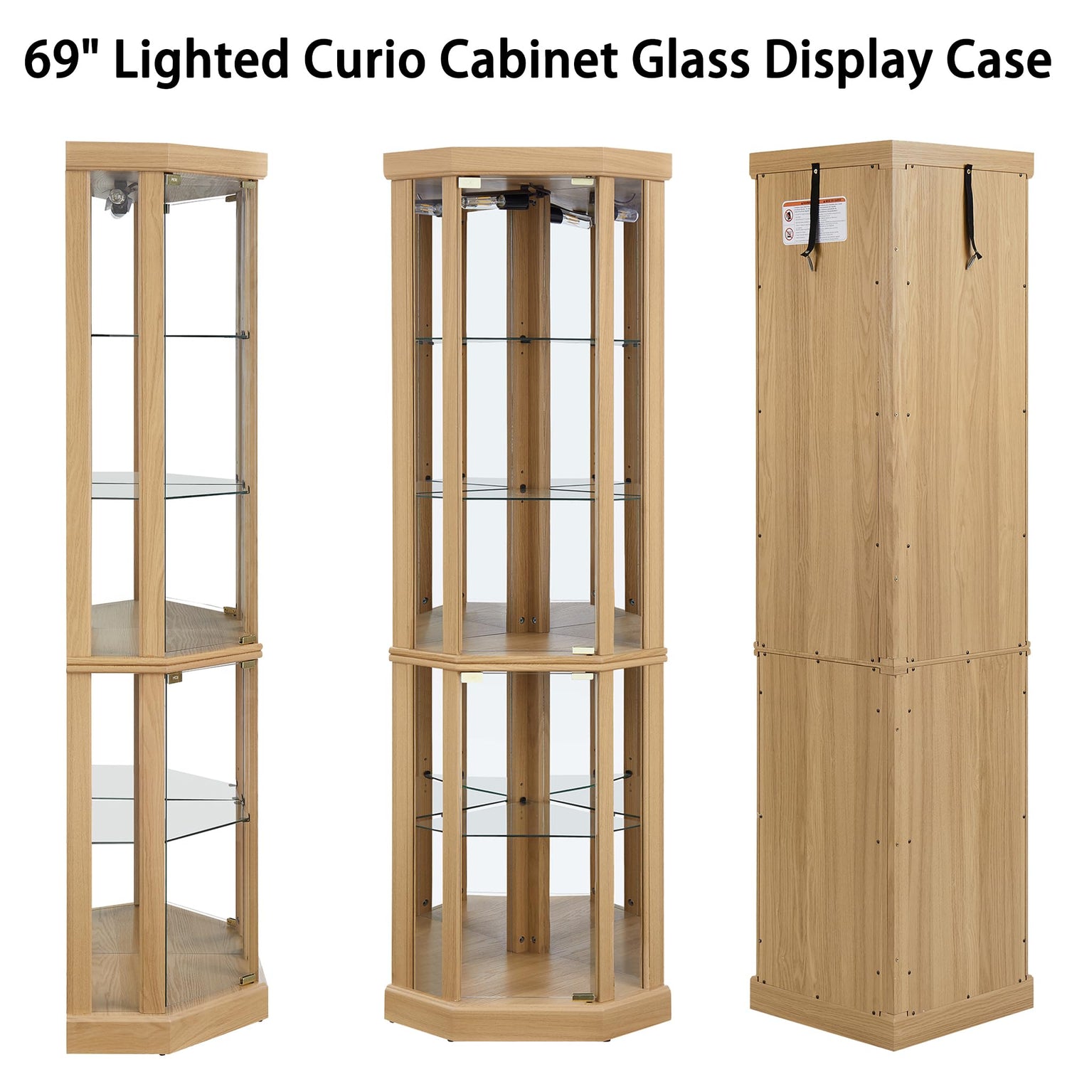 - 【High safety】Curio Corner glass display cabinet made of high quality wood for durability. The Wooden Corner Curio Cabinet has an overall weight capacity of 150 lbs. with 25 lbs. per shelf, enough for most of your storage needs.Wood-framed tempered glass doors reduce dust intrusion, ensuring a secure, dust-free and durable interior. Anti-tip device ensures that the glass display case is securely fixed to the wall, keeping you and your family safe