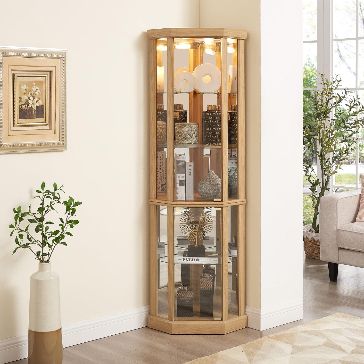TRJQBCC 69" H Lighted Corner Display Cabinet, Curio Corner Glass Cabinet w/Adjustable Shelves & Glass Door, 5-Tier Wooden Storage Display Case w/Mirrored Back Pane for Living Room(Light Oak)