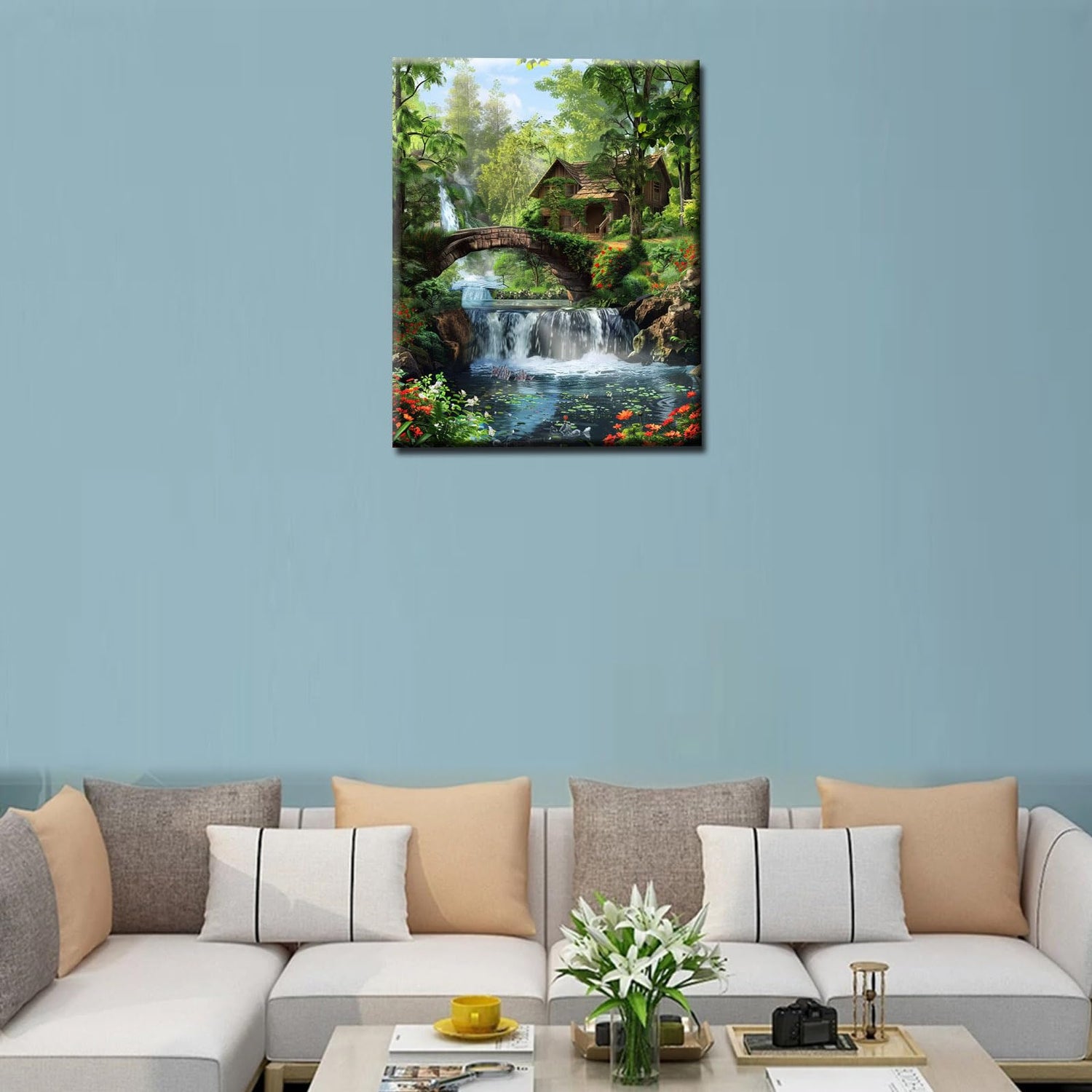 Tropical Frorest Waterfall Paint by Number for Adults Beginner,DIY Oil Painting Kits on Canvas with Brushes and Acrylic Pigment Abandoned Wooden House,Bridge Pictures Gifts 16x20 inch (Frameless)
