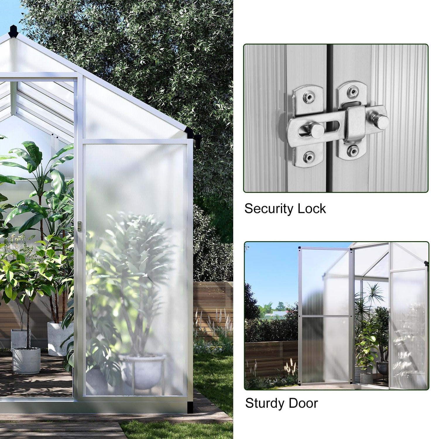 - 【High-Quality Materials】: The greenhouse features a frame made of aluminum alloy, lightweight and corrosion-resistant, capable of withstanding various weather conditions outdoors. The covering material is polycarbonate, known for its excellent light transmission and durability, providing optimal light transmission while reducing harmful UV rays by 99.9% and remaining exceptionally sturdy and resistant to breakage.