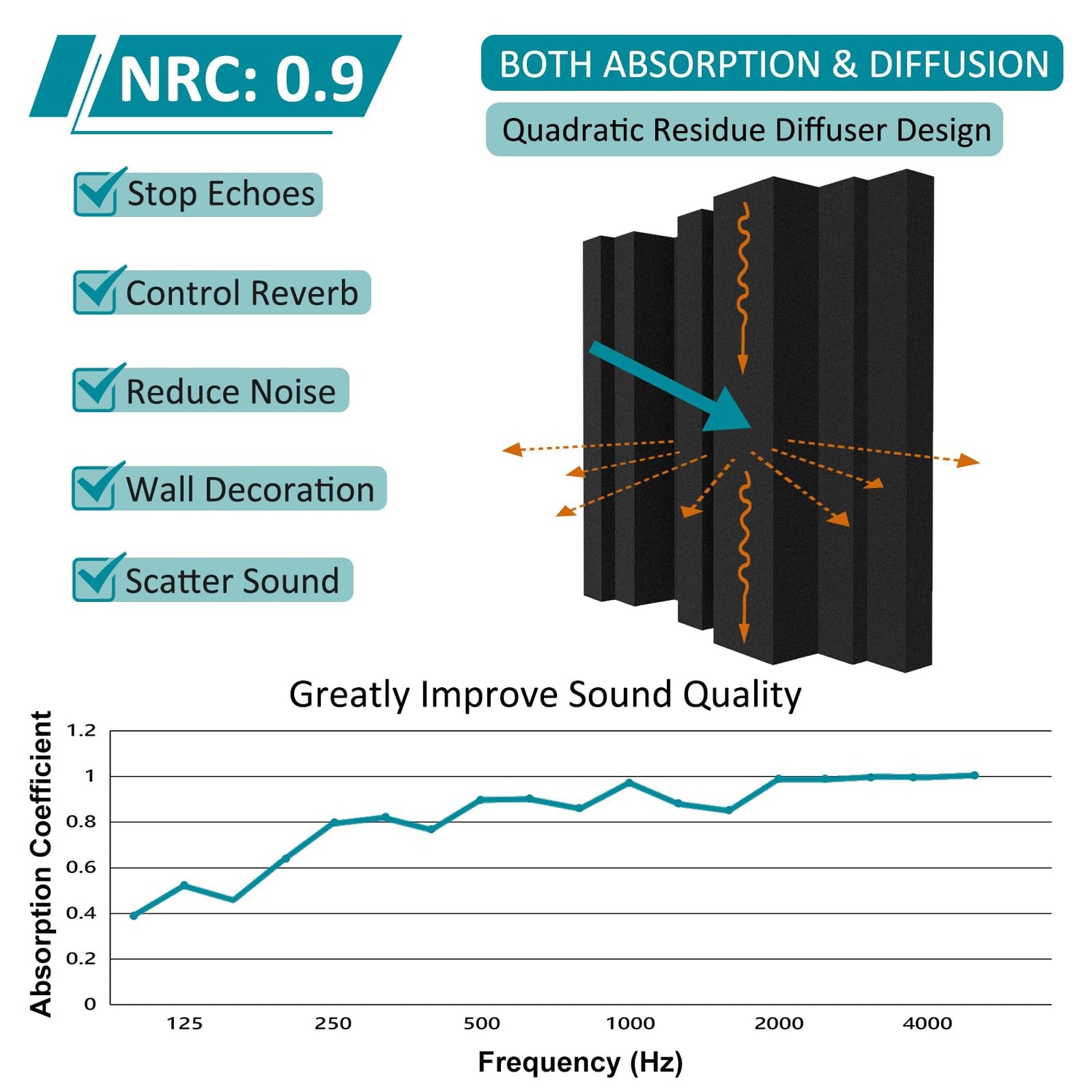 - 【SPECIFICATIONS】: Size - 12 X 12 X 3 inches, pack of 12; Coverage - 12 square feet; Weight - 0.18 lbs per panel; Material - 3” Thick and high density polyurethane; Design - Quadratic residue design enhances both sound absorption and diffusion; NRC (Noise Reduction Coefficient): 0.9