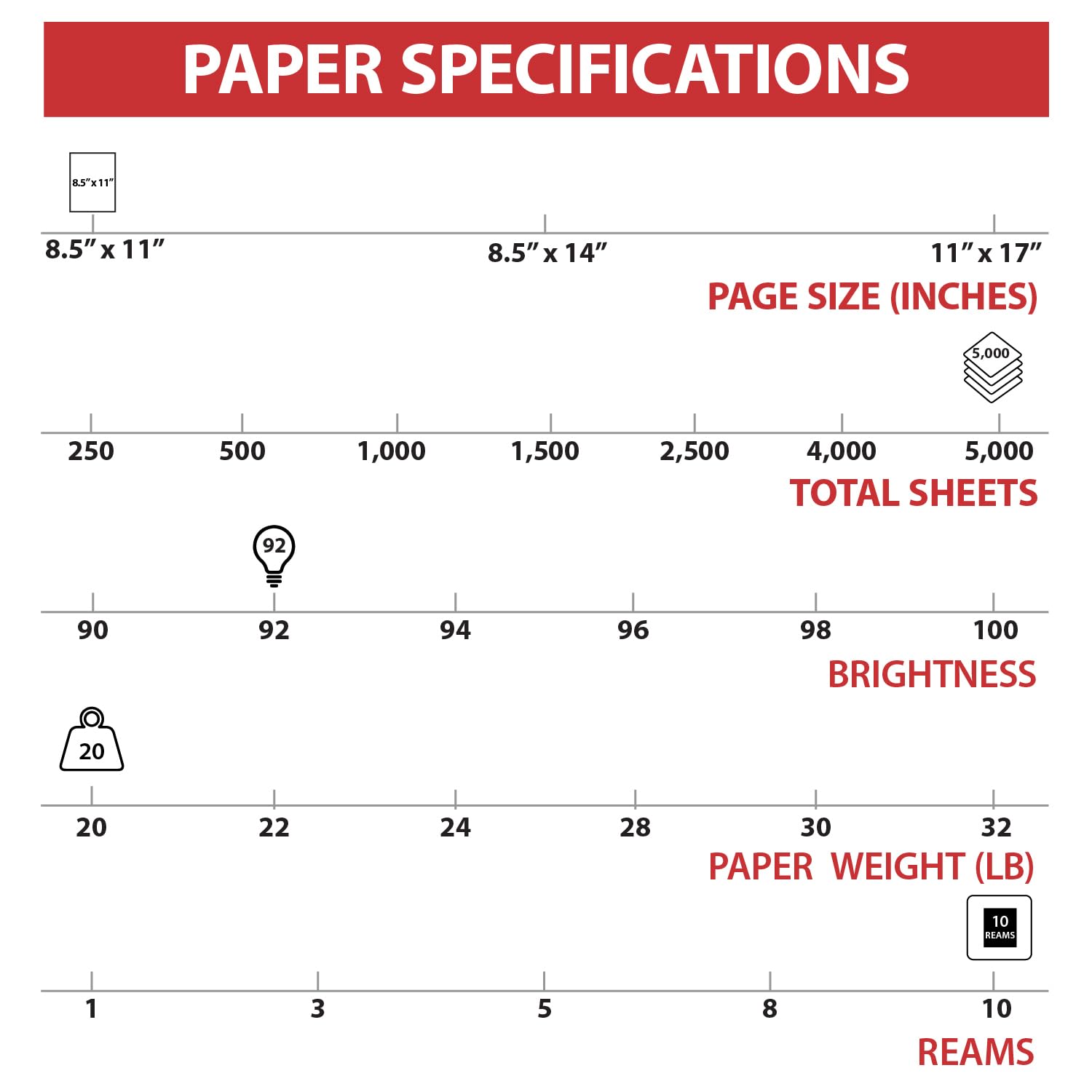 - Packaging: Packed with 10 reams per case (5000 sheets) measuring 8.5" (W) x 11" (L) (US Letter), this white copy paper provides a convenient, long-lasting supply for home and office use.
