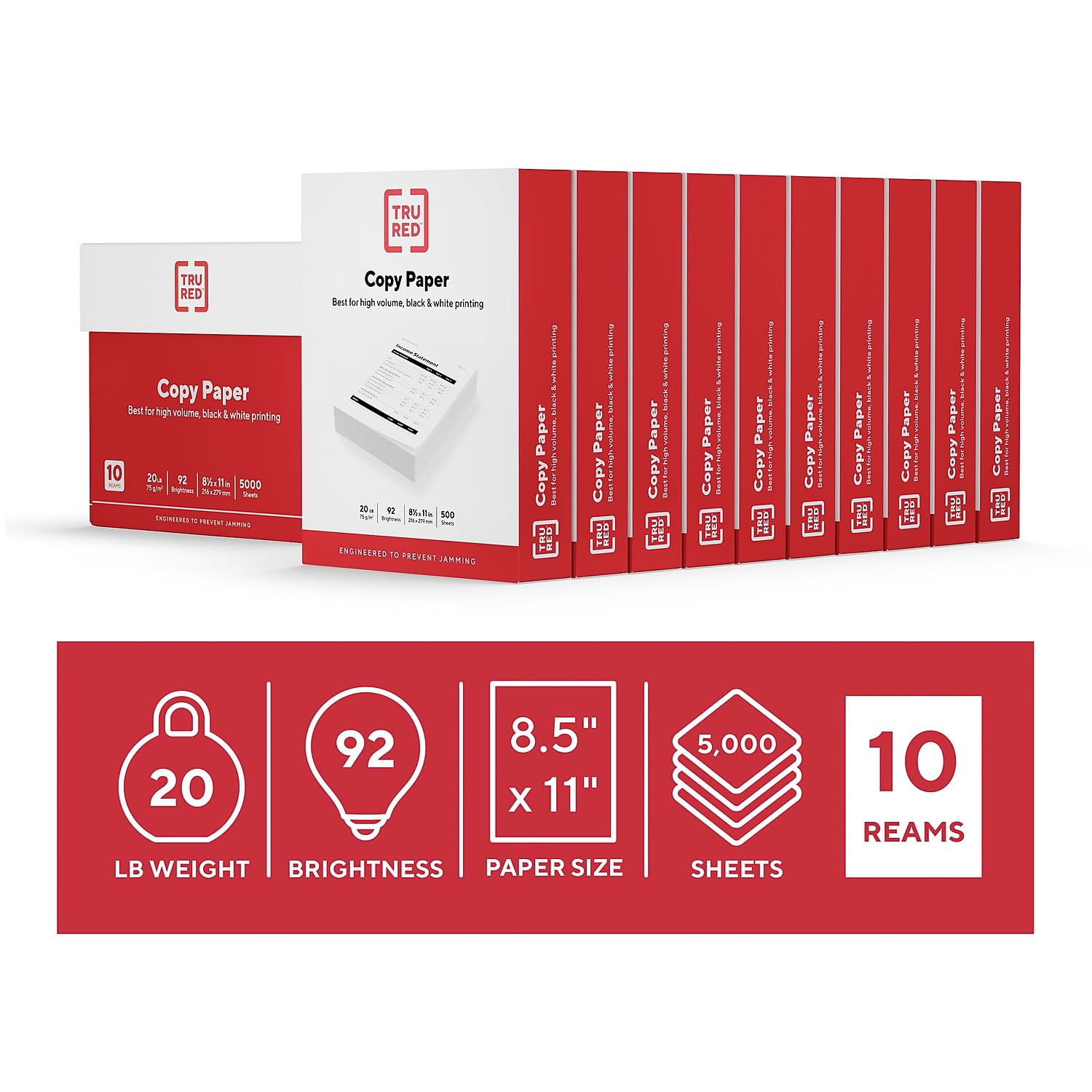 TRU RED 8.5" x 11" Copy Paper, 20 lbs., 92 Brightness, 500 Sheets/Ream, 10 Reams/Carton (TR56958)