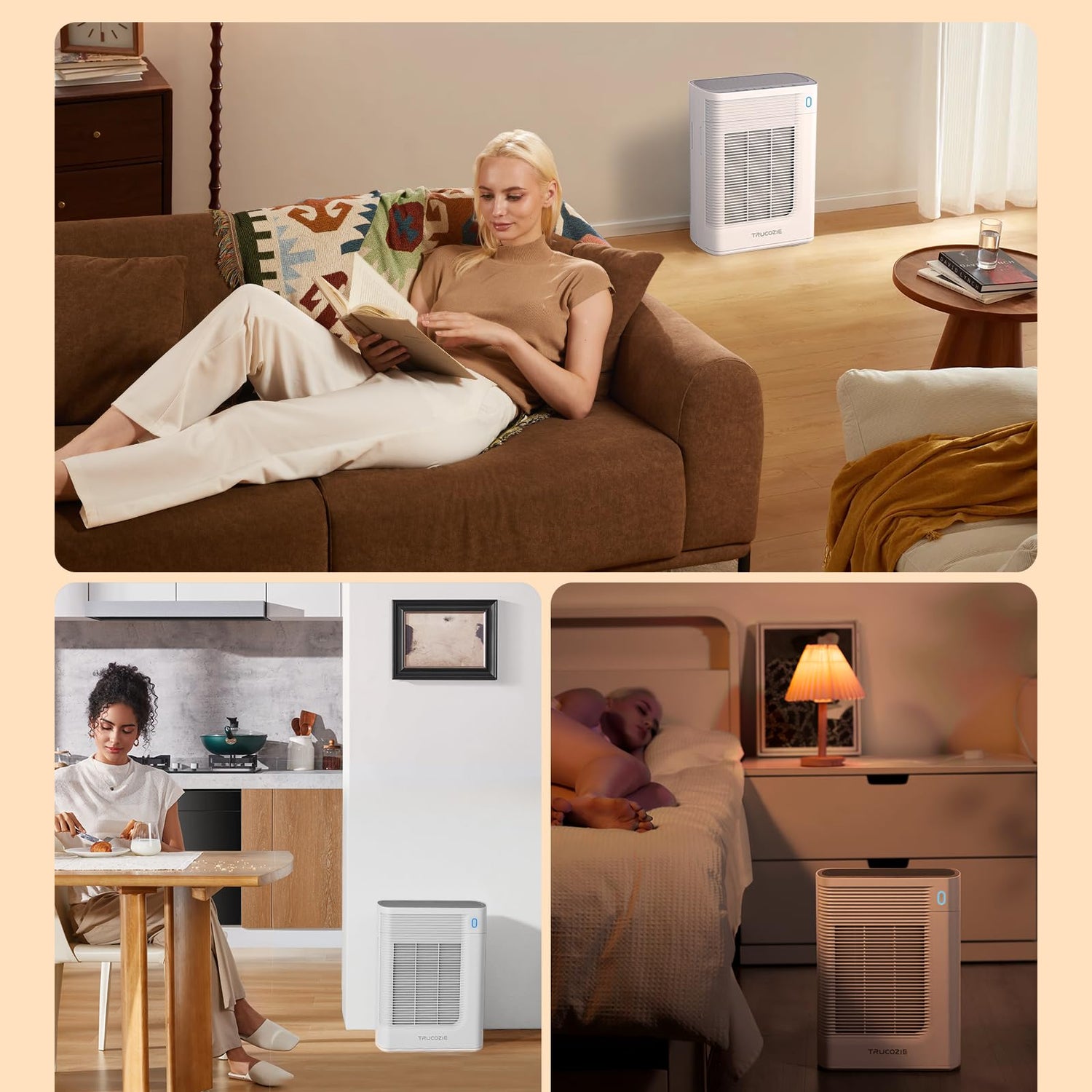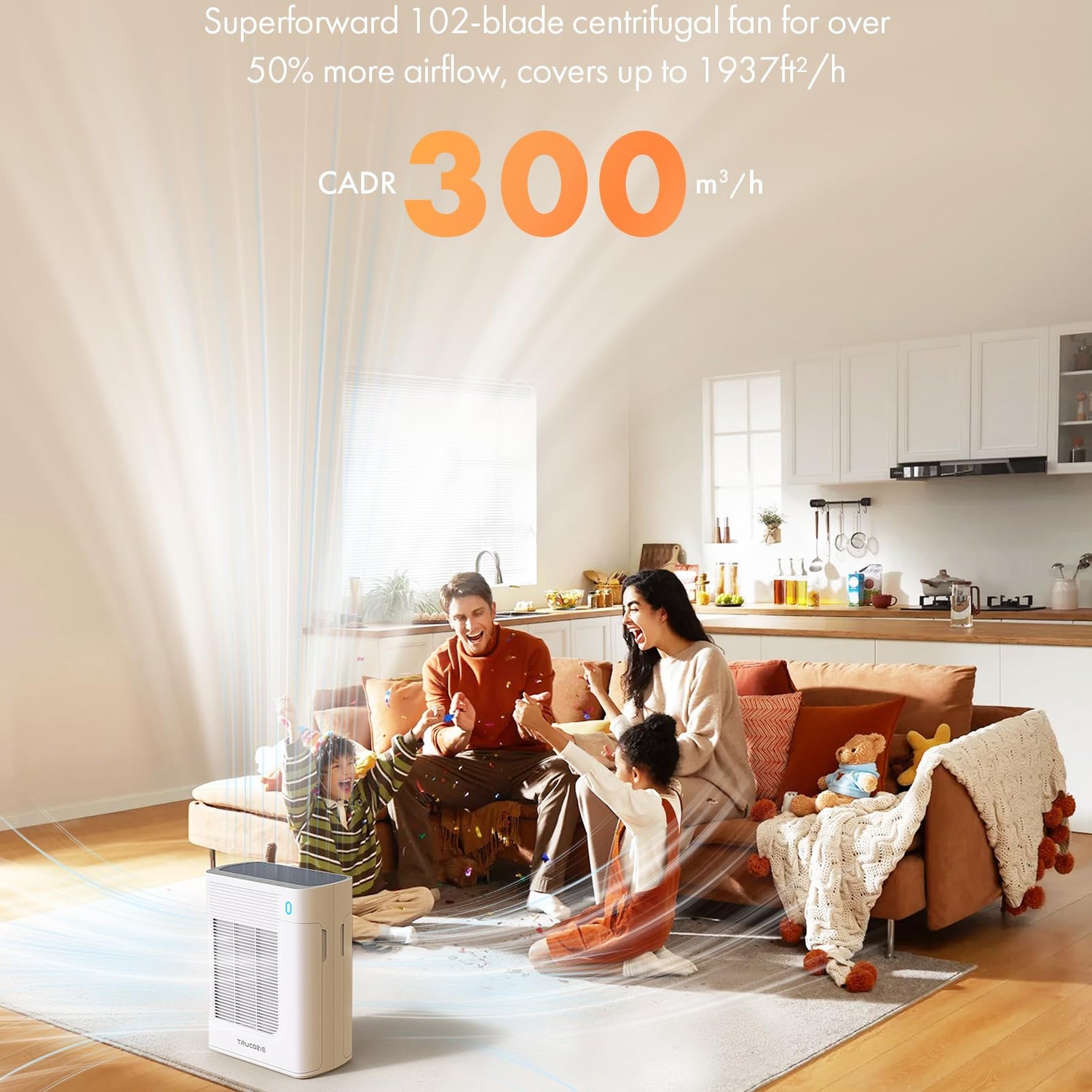 - Large Coverage: Trucozie air purifier is perfect for large, indoor spaces, especially large bedrooms. It has a CADR of 176 CFM (300 m³/h) and can purify the air of 1937 ft² space once/hour.