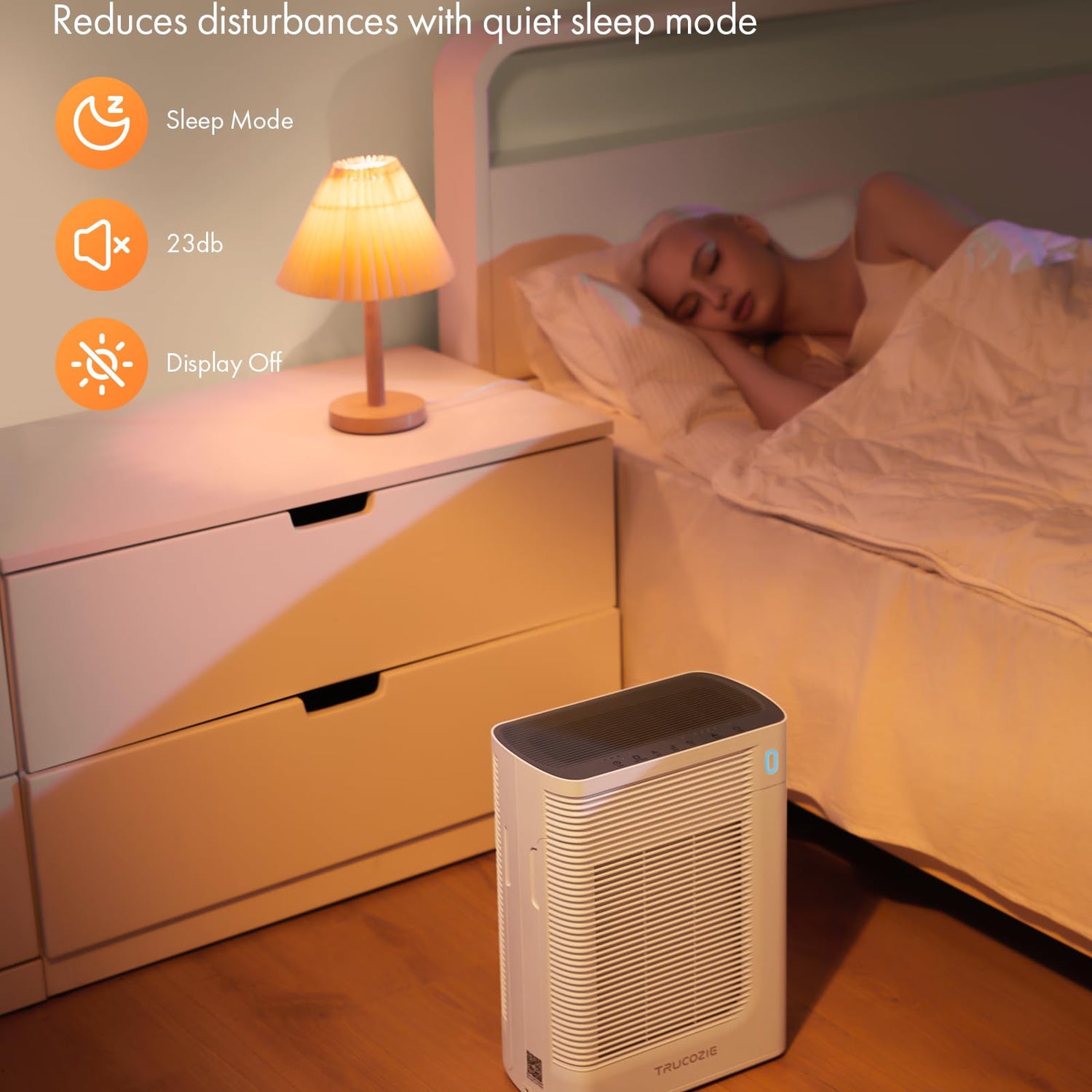 - Sleep Mode: When in sleep mode, the Trucozie T356 bedroom air purifier will automatically adjust the fan speed to run at the lowest speed with low noise (less than 23dB) to protect your air quality while you rest. ( Tested by an independent lab. )
