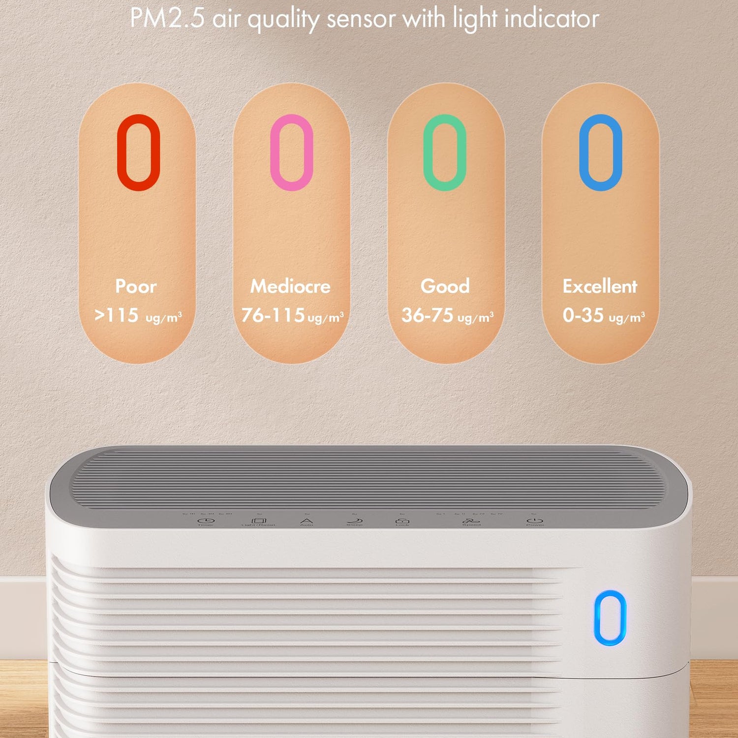 - PM 2.5 Air Quality Sensor: The air purifier is equipped with a PM2.5 dust sensor, which can monitor the air quality in the current environment in real time. When the air quality decreases, the indicator light will show purple or red, and the fan will speed up to clean the air faster. You can get the health of the air at real time.