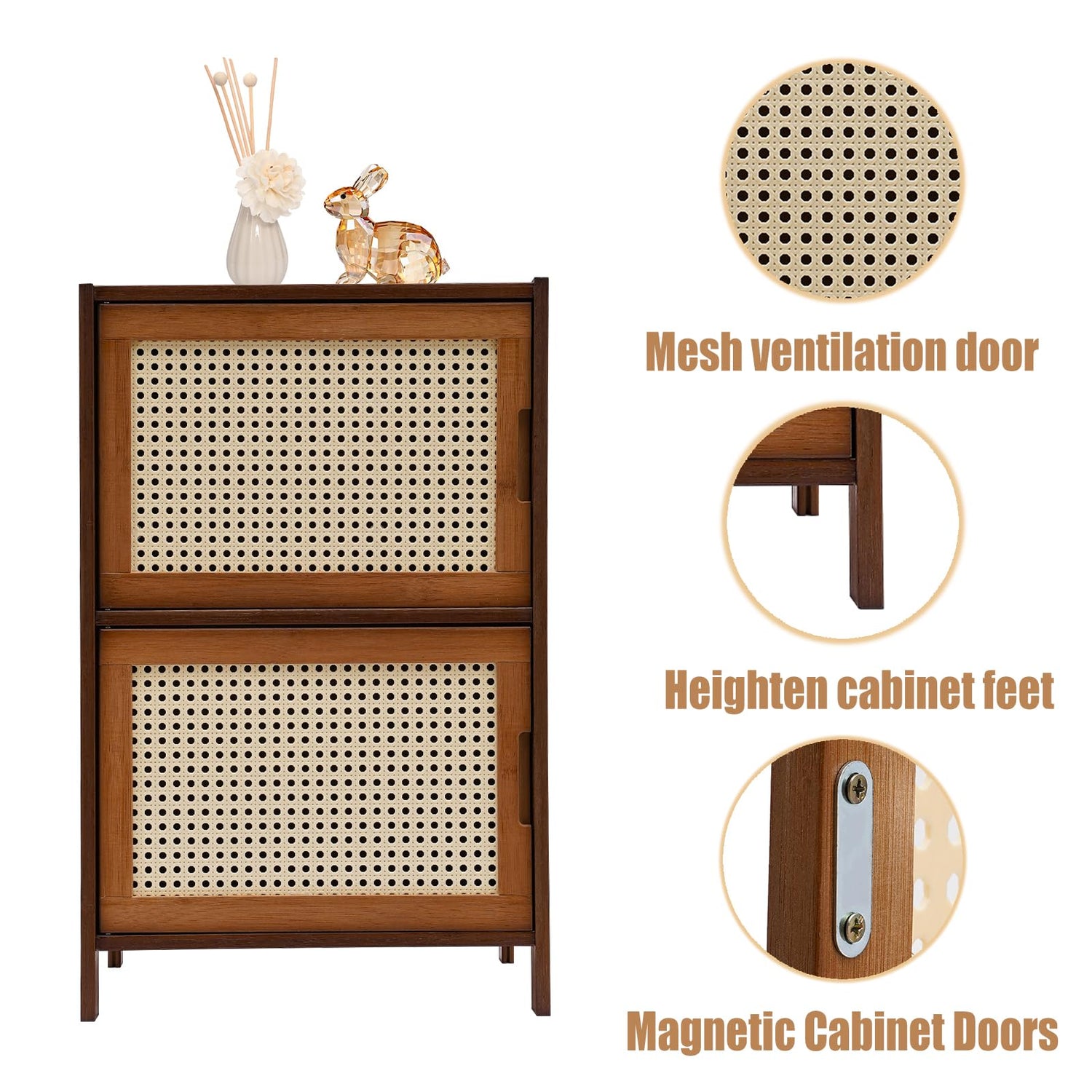 TrueyEssence 2-Tier Bamboo Nightstand with Rattan Decor Doors, Modern Bedside Table End Table Multipurpose Storage Cabinet for Bedroom Living Room Dark Brown