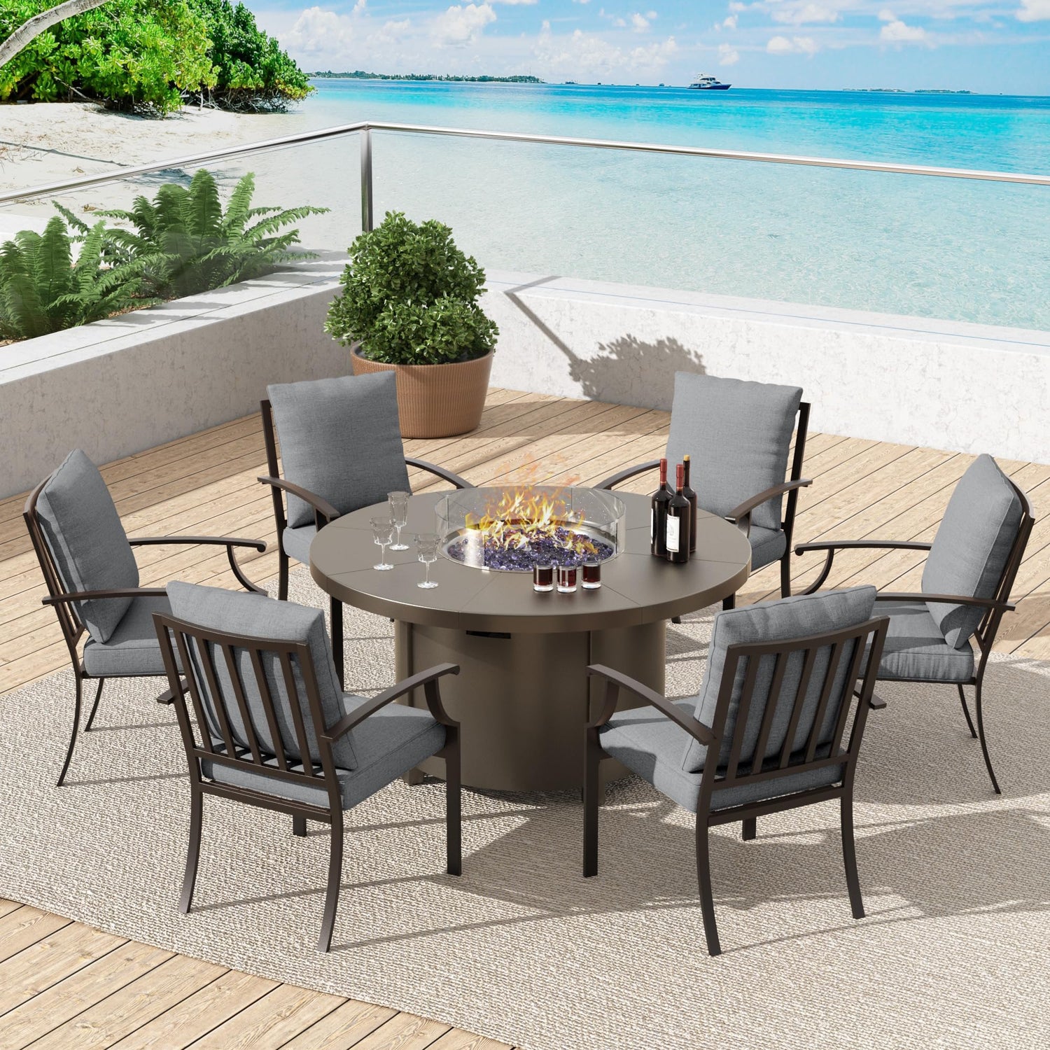 Trumbeak 7 Pcs Outdoor Patio Furniture Set with 48"/55000 BTU Outdoor Round Propane Fire Pit Table,Patio Conversation Sets 6 Fixed Chairs No-Slip Cushions and Waterproof Covers,Grey